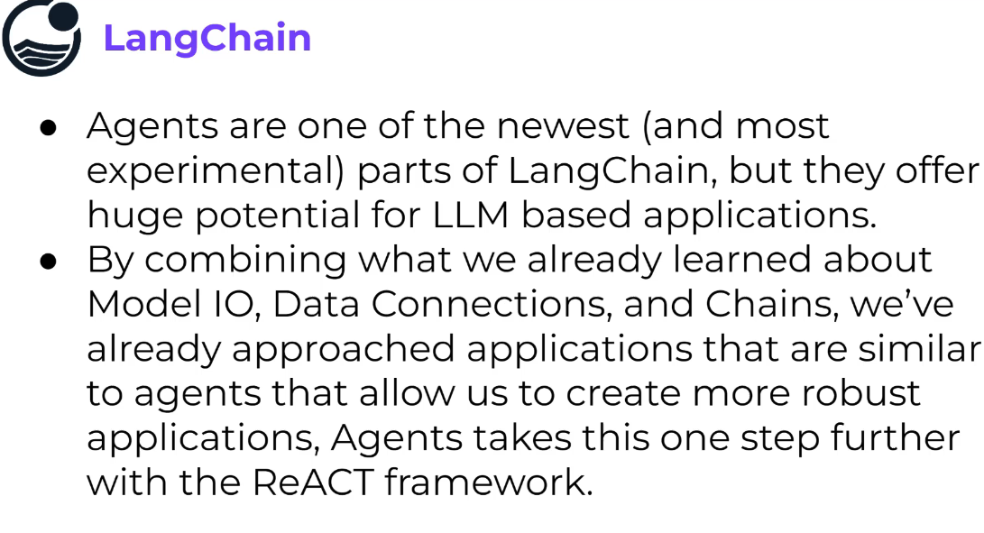 LangChain Agents are one of the newest (and most experimental) parts of LangChain, but they offer huge potential for LLM based applications. By combining what we already learned about Model IO, Data Connections, and Chains, we've already approached applications that are similar to agents that allow us to create more robust applications, Agents takes this one step further with the ReACT framework.