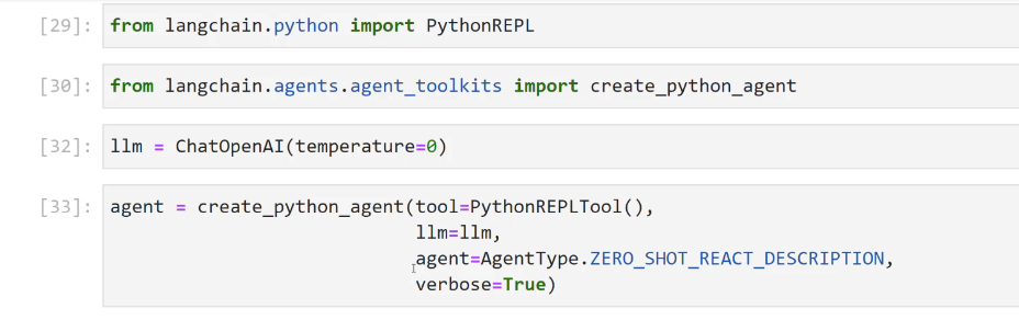 [29]: from langchain.python import PythonREPL [30]: from langchain.agents.agent, toolkits import create_python.agent [32]: 1lm = ChatOpenAI(temperature-0) [33]: agent = create_ python agent (fol.mythonmtPLTool0, 1lm=1lm, agent-Agentlype.ZERO SHOT REACT DESCRIPTION, verbose-True)