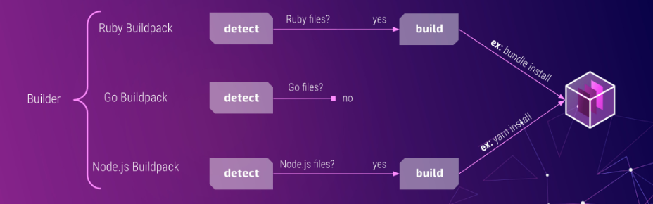 These buildpacks can be grouped together into collections called a builder. In a builder, each buildpack will inspect the application source code and detect if it should participate in the build process. For example, a Go buildpack would look for files ending in .go, while a Ruby buildpack would look for *.rb files. *Once a buildpack (or set of buildpacks) has matched, it moves on to the build step. That’s when the buildpack does its job. It might add a layer to the container image that contains a dependency, like the Go distribution, or it runs a command, like go build. ref