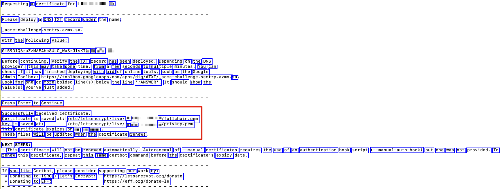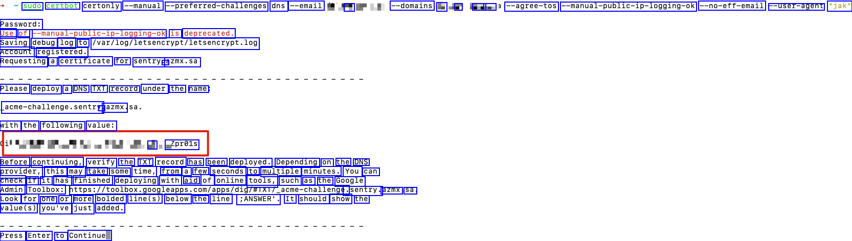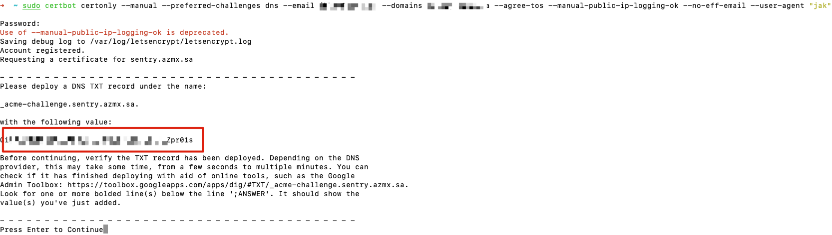 sudo certbot certonly --manual -preferred-challenges dns --email -E --domains L - : - --agree-tos --manual-public-ip-logging-ok --no-eff-email --user-agent "jak" Password: Use of -manual-public-ip-logging-ok is deprecated. Saving debug log to var/log/letsencrypt/letsencrypt.log Account registered. Requesting a certificate for sentry. azmx.sa Please deploy a DNS TXT record under the name acme-challenge.sentry : azmx. with the following value: - Zpr01s Before continuing, verify the TXT record has been deployed. Depending on the DNS provider, this may take some time, from a few seconds to multiple minutes. You can check if it has finished deploying with aid of online tools, such as the Google Admin Toolbox: nttps://toolbox.googleapps.com/apps/dig/#TXT/.acme-challenge. .sentry. azmx. sa Look for one or more bolded line(s) below the line ;ANSWER'. It should show the value(s) you've just added. Press Enter to Continue