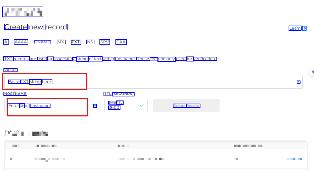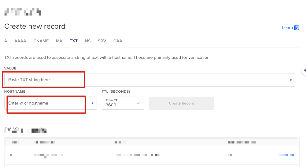 #Tury Create new record Learn A AAAA CNAME MX TXT NS SRV CAA TXT records are used to associate a string oftext with a hostname. These are primarily used for verification. VALUE Paste TXT string here * HOSTNAME TTL SECONDS) Enter TTL * 3600 Enter a or hostname Create Record