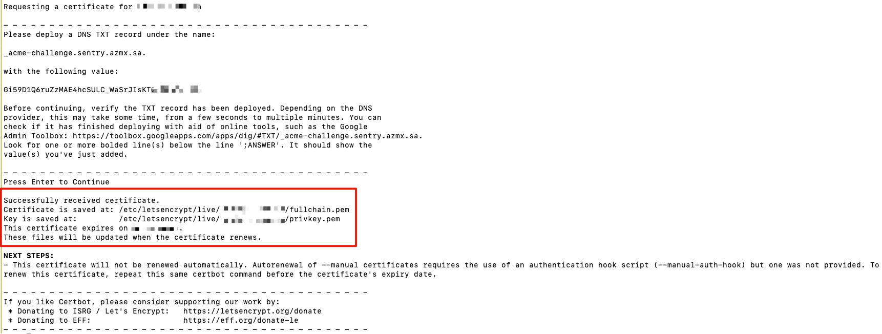 Requesting a certificate for l Please deploy a DNS TXT record under the name acme-challenge. sentry.azmx.sa. with the following value: G1590106ruZZMAE4hcSULC.WaSrJIsKTez L - Before continuing, verify the TXT record has been deployed. Depending on the DNS provider, this may take some time, from a few seconds to multiple minutes. You can check if it has finished deploying with aid of online tools, such as the Google Admin Toolbox: https://toolbox.gogleapps.com/apps/dig/A1XT/.acme-challenge.sentry.azmx. sa Look for one or more bolded line(s) below the line ';ANSWER'. It should show the value(s) you've just added. Press Enter to Continue Successfully received certificate. Certificate is saved at: ete/letsenctrypt/live Key is saved at: This certificate expires on - L : These files will be updated when the certificate renews "/fullchain.pem w/privkey.pem lete/letsencrypt/livel - : NEXT STEPS: This certificate will not be renewed automatically. Autorenewal of --manual certificates requires the use of an authentication hook script (--manual-auth-hook) but one was not provided. To renew this certificate, repeat this same certbot command before the certificate's expiry date. If you like Certbot, please consider supporting our work by: Donating to ISRG / Let's Encrypt: stes/Asteerpt.ergemnte Donating to EFF: httosileff.org/donate-le