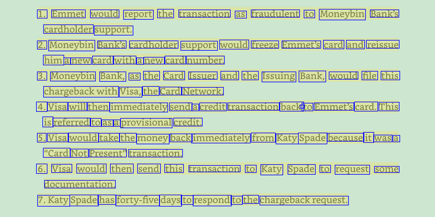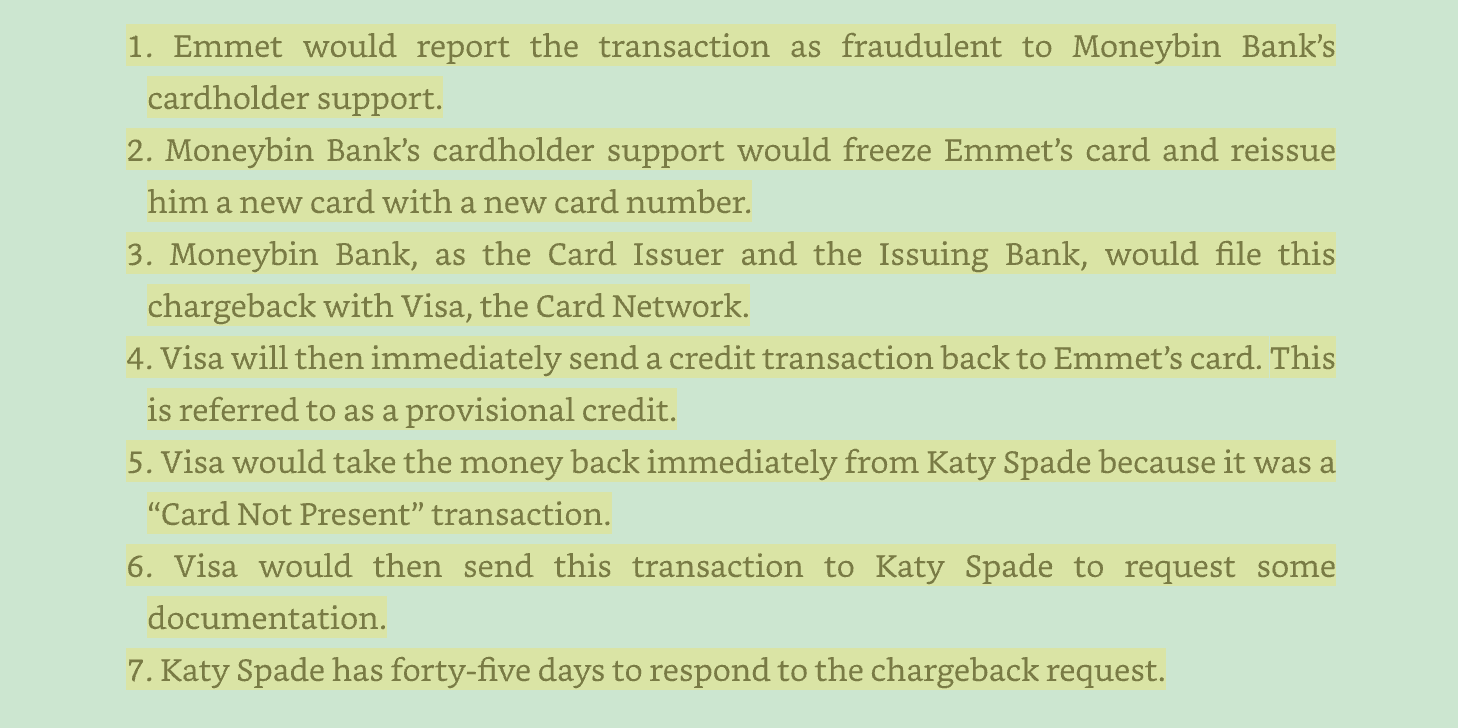 1. Emmet would report the transaction as fraudulent to Moneybin Bank's cardholder support. 2. Moneybin Bank's cardholder support would freeze Emmet's card and reissue him a new card with a new card number. 3. Moneybin Bank, as the Card Issuer and the Issuing Bank, would file this chargebackwith Visa, the Card Network. 4. Visa will then immediately send a credit transaction back - to Emmet's card. This is referred to as a provisional credit. 5. Visa would take the money back immediately from Katy Spade because it was a "Card Not Present" transaction. 6. Visa would then send this transaction to Katy Spade to request some documentation. 7.Katy Spade has forty-five days to respond to the chargebackrequest.