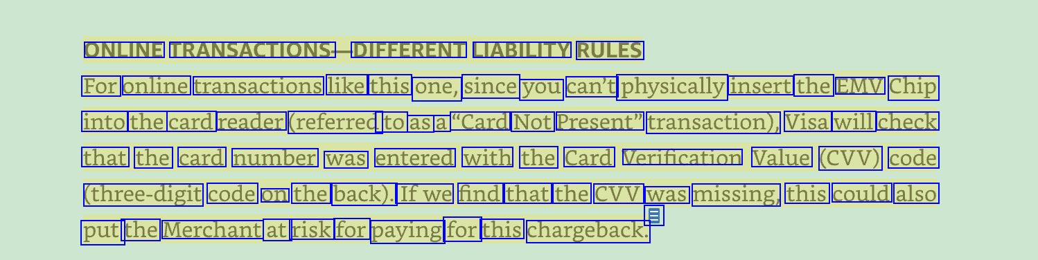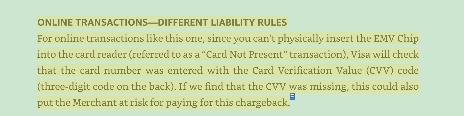 ONLINE TRANSACTIONS: DIFFERENT LIABILITY RULES For online transactions like this one, since you can't physically insert the EMV Chip into the card reader (referred to as a "Card Not Present" transaction), Visa will check that the card number was entered with the Card Verification Value (CVV) code (three-digit code on the back). Ifwe find that the CVV was missing, this could also E put the Merchant at risk for paying for this chargeback.