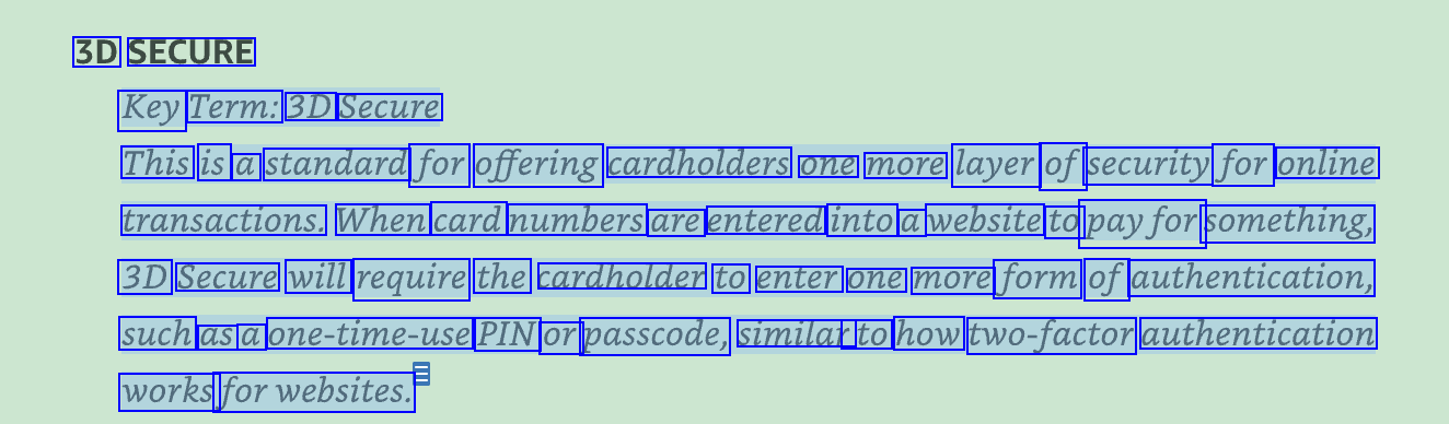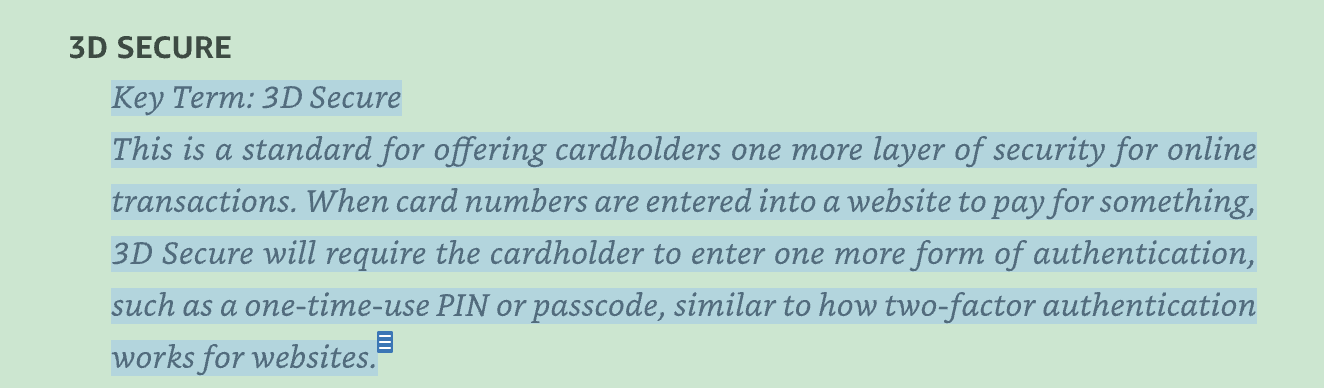 3D SECURE Key Term: 3D Secure This is a standard for offering cardholders one more layer of security for online transaction.s. When card numbers are entered into a website to payfor something, 3D Secure will require the cardholder to enter one more form of authentication, such as a one-time-use PIN Or passcode, similar to how two-factor authentication works forwebsites.
