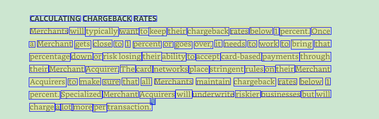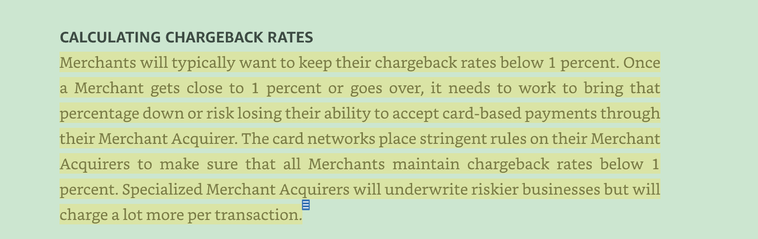 CALCULATING CHARGEBACK RATES Merchants will typically want to keep their chargeback rates below 1 percent. Once a Merchant gets close to 1 percent or goes over, it needs to work to bring that percentage down or risklosing their ability to accept card-based payments through their Merchant Acquirer. The card networks place stringent rules on their Merchant Acquirers to make sure that all Merchants maintain chargeback rates below 1 percent. Specialized Merchant Acquirers will underwrite riskier businesses but will E charge a lot more per transaction.
