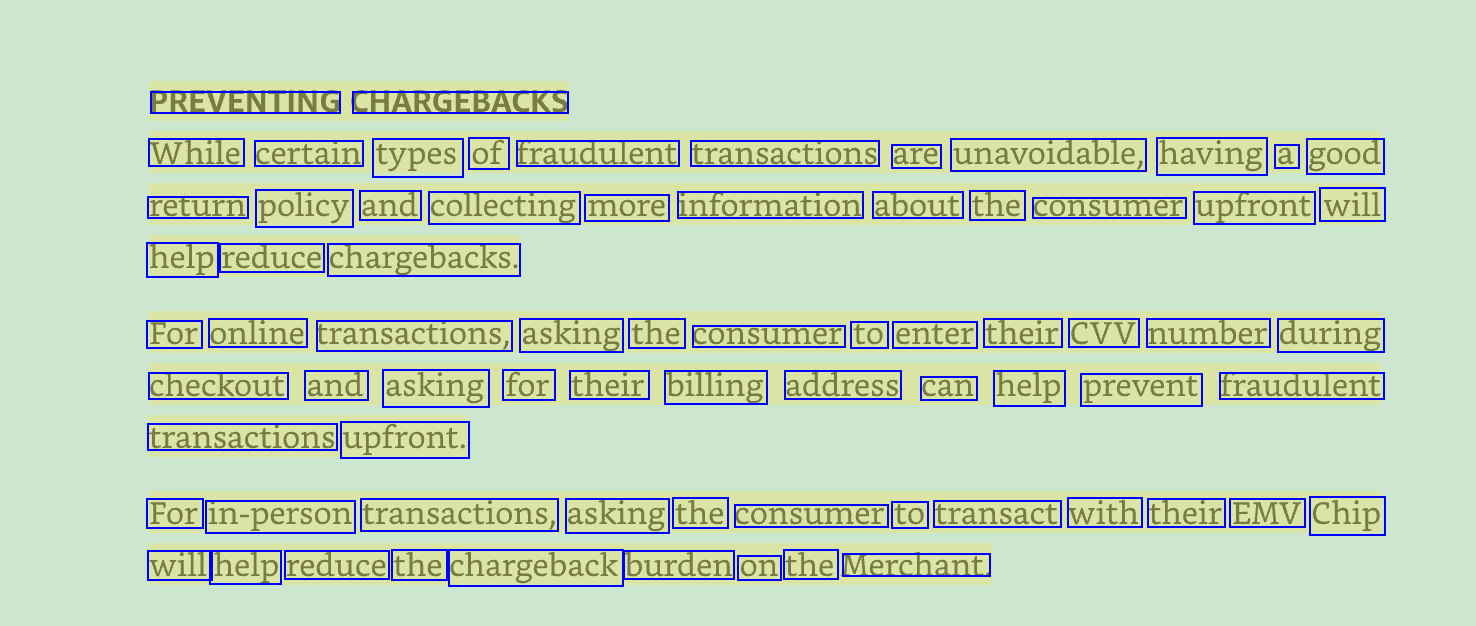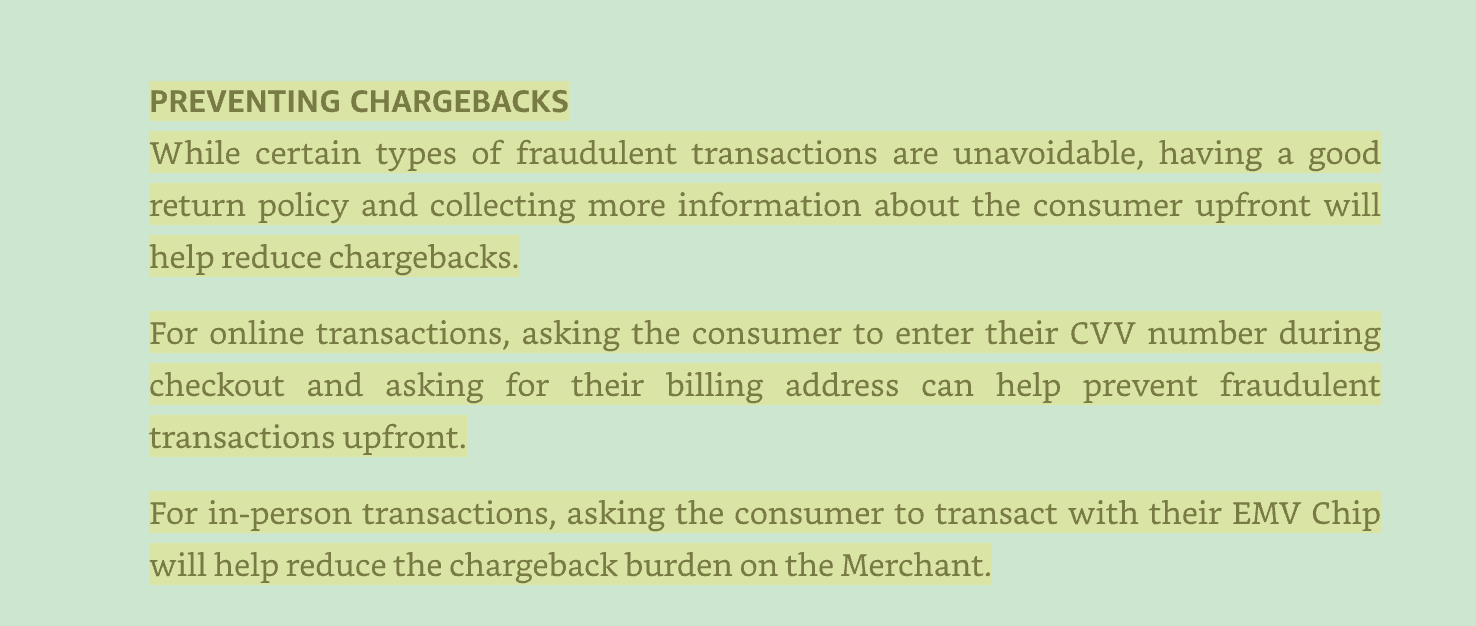 PREVENTING CHARGEBACKS While certain types of fraudulent transactions are unavoidable, having a good return policy and collecting more information about the consumer upfront will help reduce chargebacks. For online transactions, asking the consumer to enter their CVV number during checkout and asking for their billing address can help prevent fraudulent transactions upfront. For in-person transactions, asking the consumer to transact with their EMV Chip will help reduce the chargeback burden on the Merchant.