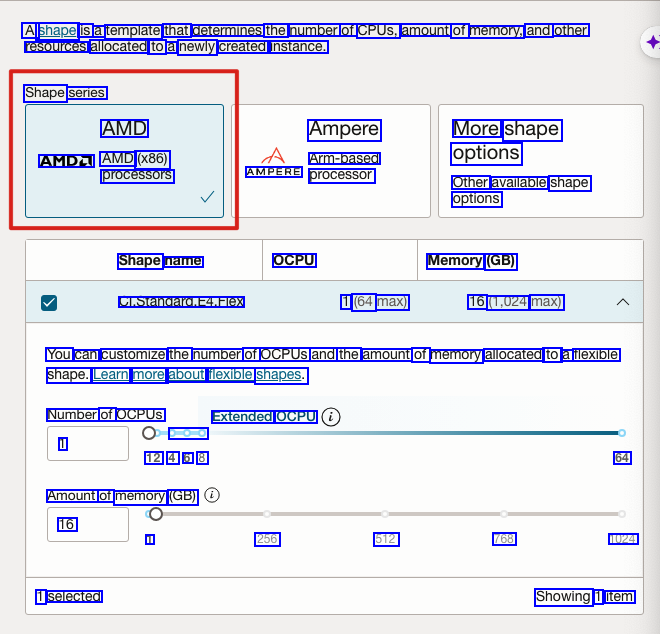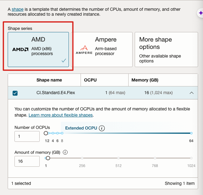 A shape is a template that determines the number of CPUS, amount of memory, and other resources allocated to a newly created instance. Shape series AMD Ampere Arm-based More shape options AMDL AMD (x86) processors AMPERE processor Other available shape options Shape name OCPU Memory (GB) l.Standard.E4.Flex 1 (64 max) 16 (1,024 max) You can customize the number of OCPUS and the amount of memory allocated to a rlexible shape. Learn more about flexible shapes. Number of OCPUS Extended OCPU 0-0- 12 4 6 8 1 64 Amount of memory (GB) 16 1 256 512 768 1024 1 selected Showing 1 item