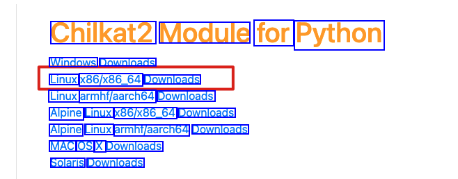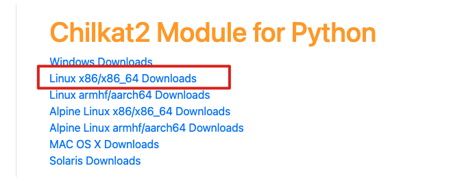 Chilkat2 Module for Python Windows Downloads Linux x86/x86_64 Downloads Linux armhfjaarch64 Downloads Alpine Linux x86/x86_64 Downloads Alpine Linux armhfjaarch64 Downloads MAC OS X Downloads Solaris Downloads