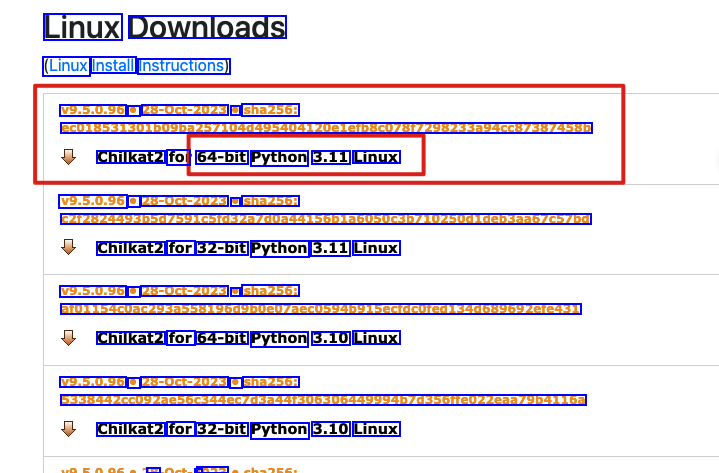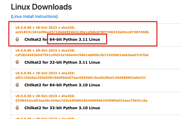 Linux Downloads (Linux Install Instructions) v9.5.0.96 e 28-Oct-2023 o sha256: ec018531301b09ba257104d495404120elefb8c07817298233a94cc87387458b Chilkat2 fo 64-bit Python 3.11 Linux v9.5.0.96 e 28-0ct-2023 e sha256: c212824493b5d7591c5fd32a7d0a44156b1a6050c3b710250dideb3aa67c57bd Chilkat2 for 32-bit Python 3.11 Linux V9.5.0.96 e 28-0ct-2023 o sha256: af01154c0ac293a558196d9b0e07aec0594b915ecfdcofed134d689692efe431 Chilkat2 for 64-bit Python 3.10 Linux V9.5.0.96 e 28-0ct-2023 e sha256: 5338442cc092ae56c344ec7d3a441306306449994b7d356ffe022eaa79b4116a Chilkat2 for 32-bit Python 3.10 Linux a - 2