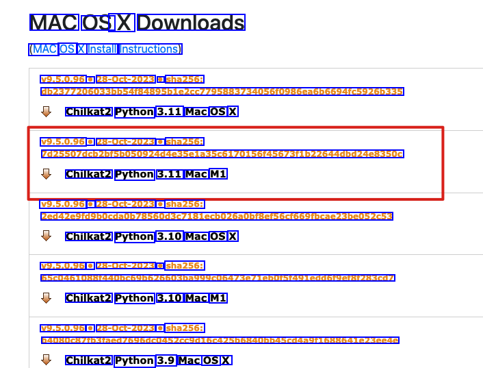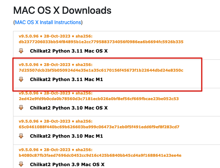 MAC OS X Downloads (MAC OS X Install Instructions) v9.5.0.96 e 28-Oct-2023 e sha256: db2377206033bb54184895b1e2cc7795883734056f0986ea6b6694fc5926b335 Chilkat2 Python 3.11 Mac OS X v9.5.0.96 e 28-0ct-2023 e sha256: 7d25507dcb2bf5b05050924d4e35e1a35c6170156145673f1b22644dbd24e8350c Chilkat2 Python 3.11 Mac M1 V9.5.0.96 e 28-Oct-2023 e sha2568 2ed42e9fd9b0cda0b78560d3c7181ecb026a0bf8ef56cf669fbcae23be052c53 Chilkat2 Python 3.10 Mac OS X v9.5.0.96 e 28-Oct-2023 ) sha256: 55c04610810881440bc69b626603ba999c06473e71eb0f51491edd6f9ef81283cd7 Chilkat2 Python 3.10 Mac M1 v9.5.0.96 e 28-Oct-2023 e sha256: b4080c871b3faed7696dc0452cc9d16c425b6840bb45cd4a9f1688641e23ee4e Chilkat2 Python 3.9 Mac OS X