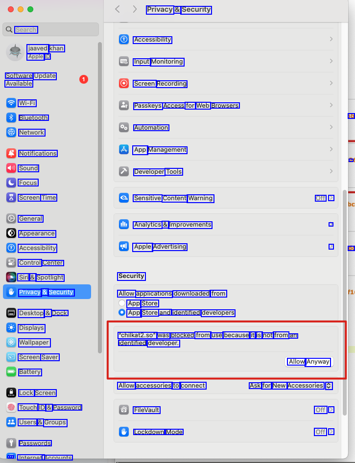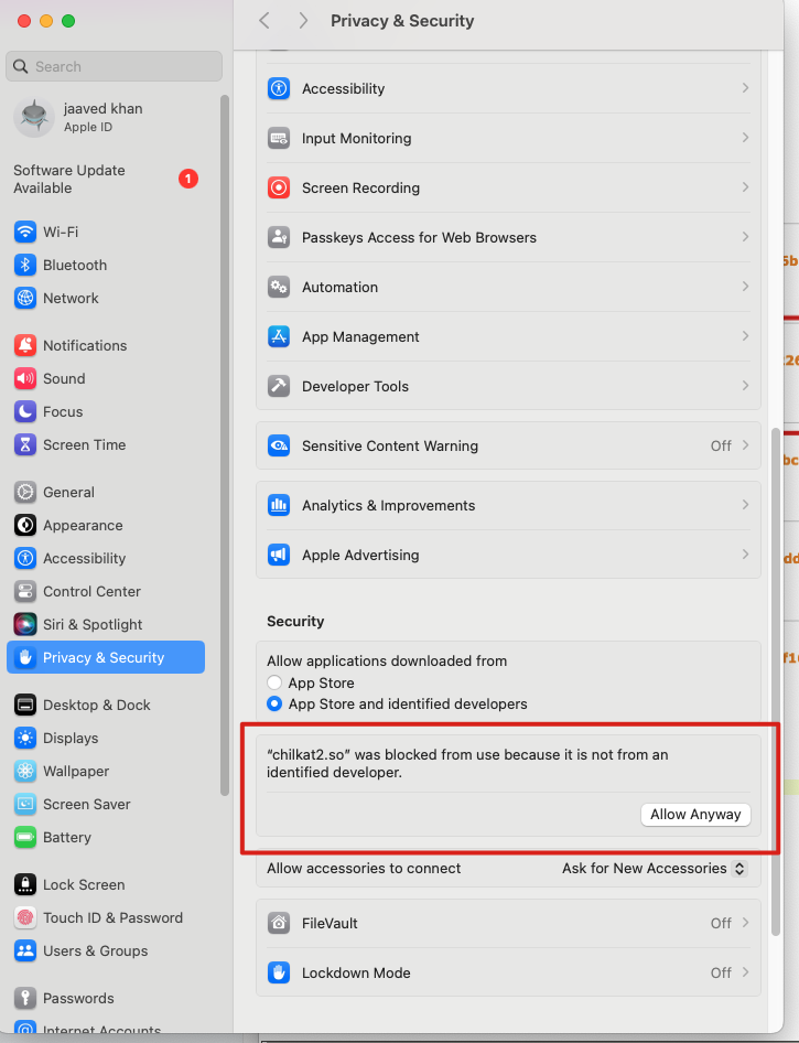 Privacy & Security Search Accessibility Input Monitoring Screen Recording jaaved khan Apple ID Software Update Available Wi-Fi Bluetooth Network Notifications Sound Focus Screen Time General Appearance Accessibility Control Center Siri & Spotlight Privacy & Security Desktop & Dock Displays Wallpaper Screen Saver Battery Lock Screen Touch ID & Password Users & Groups Passwords Internat Accounts Passkeys Access for Web Browsers b Automation App Management Developer Tools à Sensitive Content Warning Analytics & Improvements Apple Advertising Off > 2 > d Security Allow applications downloaded from App Store and identified developers App Store "chilkat2.so" was blocked from use because it is not from an identified developer. Allow Anyway Allow accessories to connect Ask for New Accessories C FileVault Lockdown Mode Off > Off >