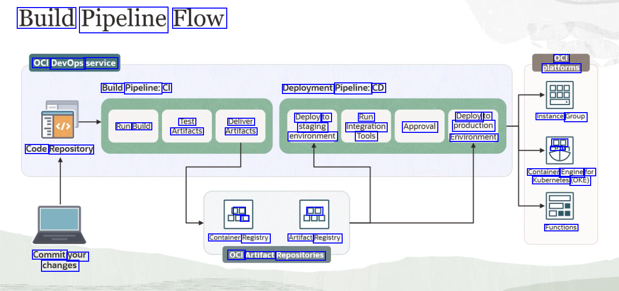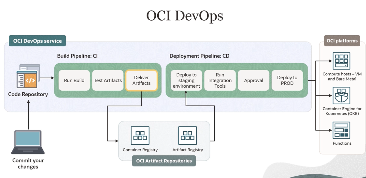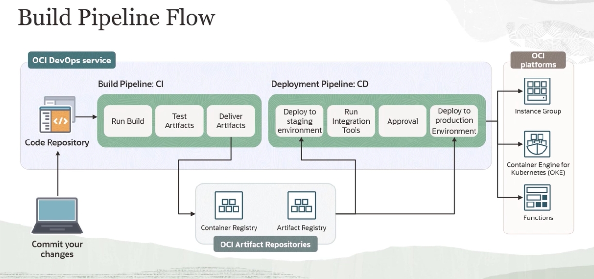 Build Pipeline Flow OCI platforms OCI DevOps service Build Pipeline: CI Deployment Pipeline: CD Deploy to Run Deploy to Instance Group Test Deliver Artifacts Run Build Artifacts staging Integration Approval production environment Tools Environment DD ar Code Repository Container Engine for Kubernetes (OKE) DE L DE Functions Container Registry Artifact Registry OCI Artifact Repositories Commit your changes