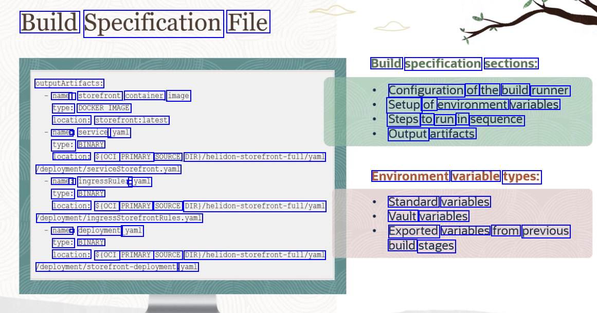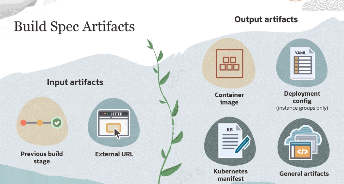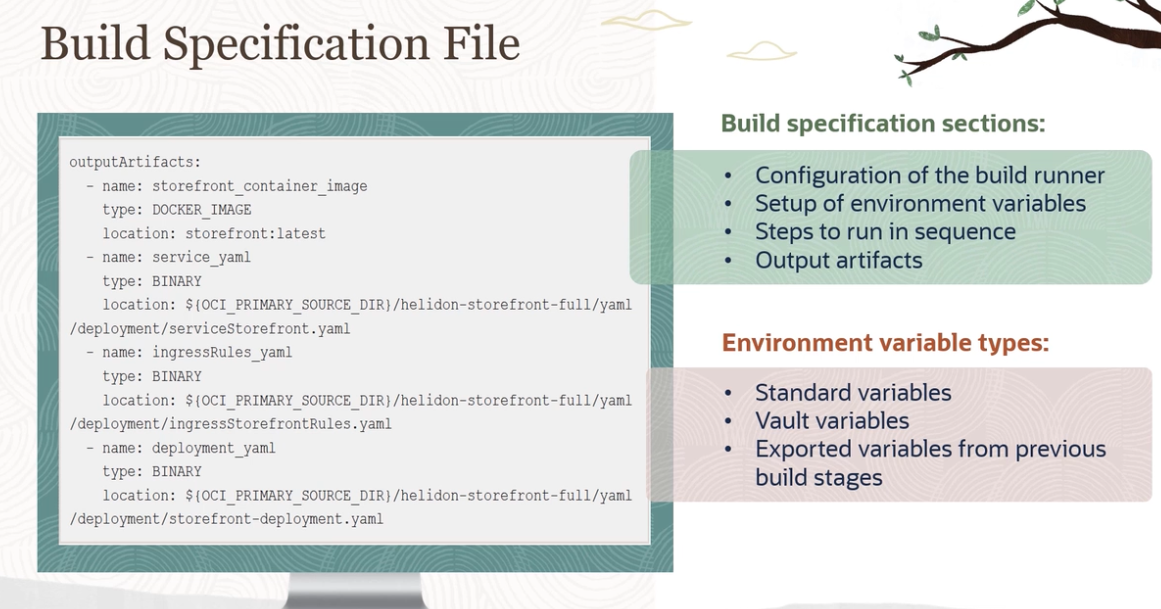 Build Specification File Build specification sections: outputArtifacts: name: : type: DOCKER_IMAGE location: storefront:latest name: : service yaml type: BINARY of the build storefront container image Configuration runner Setup of environment variables Steps to run in sequence Output artifacts location: $(OCI PRIMARY SOURCE DIR)/helidon-storefront-full/yaml deployment/servicestorefront.yaml name: : ingressRules - yaml type: BINARY Environment variable types: location: $(OCI PRIMARY SOURCE DIRI/helidon-storefront-full/yaml Standard variables Vault variables deployment/ingressstorefrontRules.yaml name: deployment yaml type: BINARY Exported variables from previous build stages location: $(OCI PRIMARY SOURCE DIRI/helidon-storefront-full/yaml deployment/storefront-deployment yaml