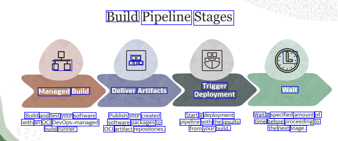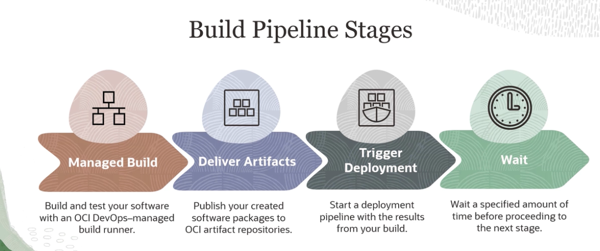 Build Pipeline Stages DO E C 5E Trigger Deployment Managed Build Deliver Artifacts Wait Build and test your software Publish your created Start a deployment pipeline with the results from your build. Wait a specified amount of time before proceeding to the next stage. with an OCI DevOps-managed software packages to build runner. OCI artifact repositories.