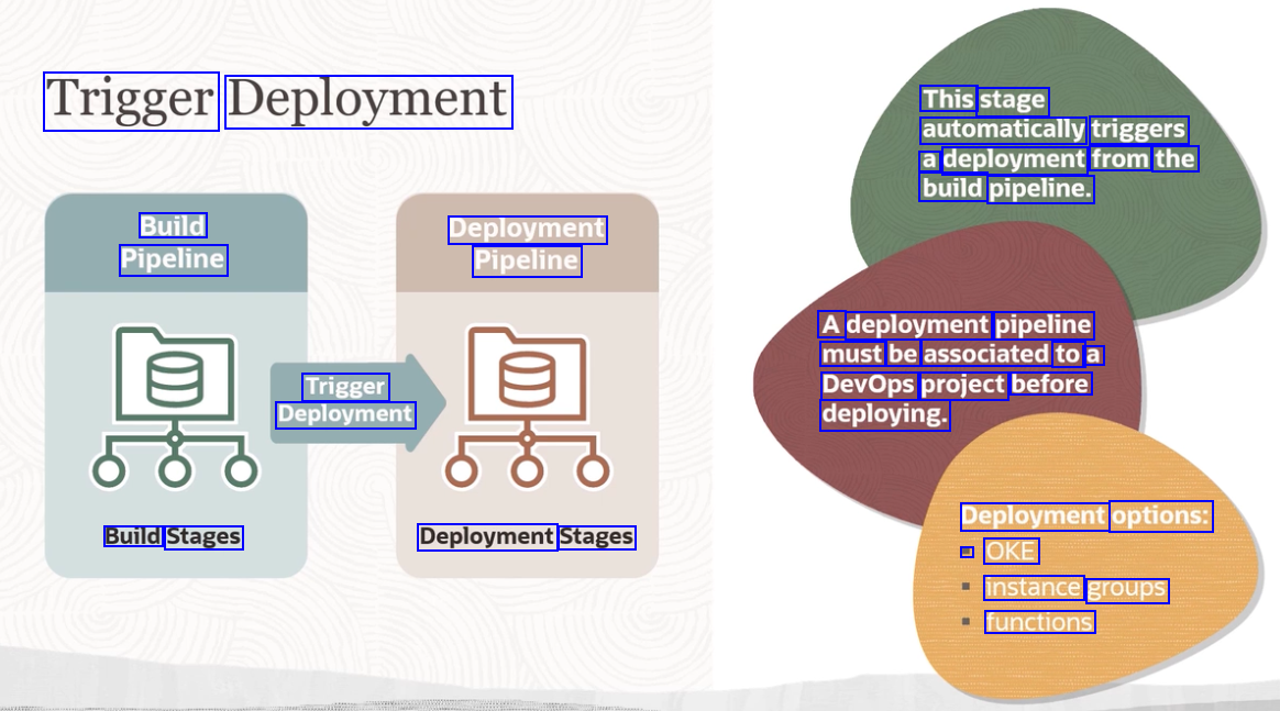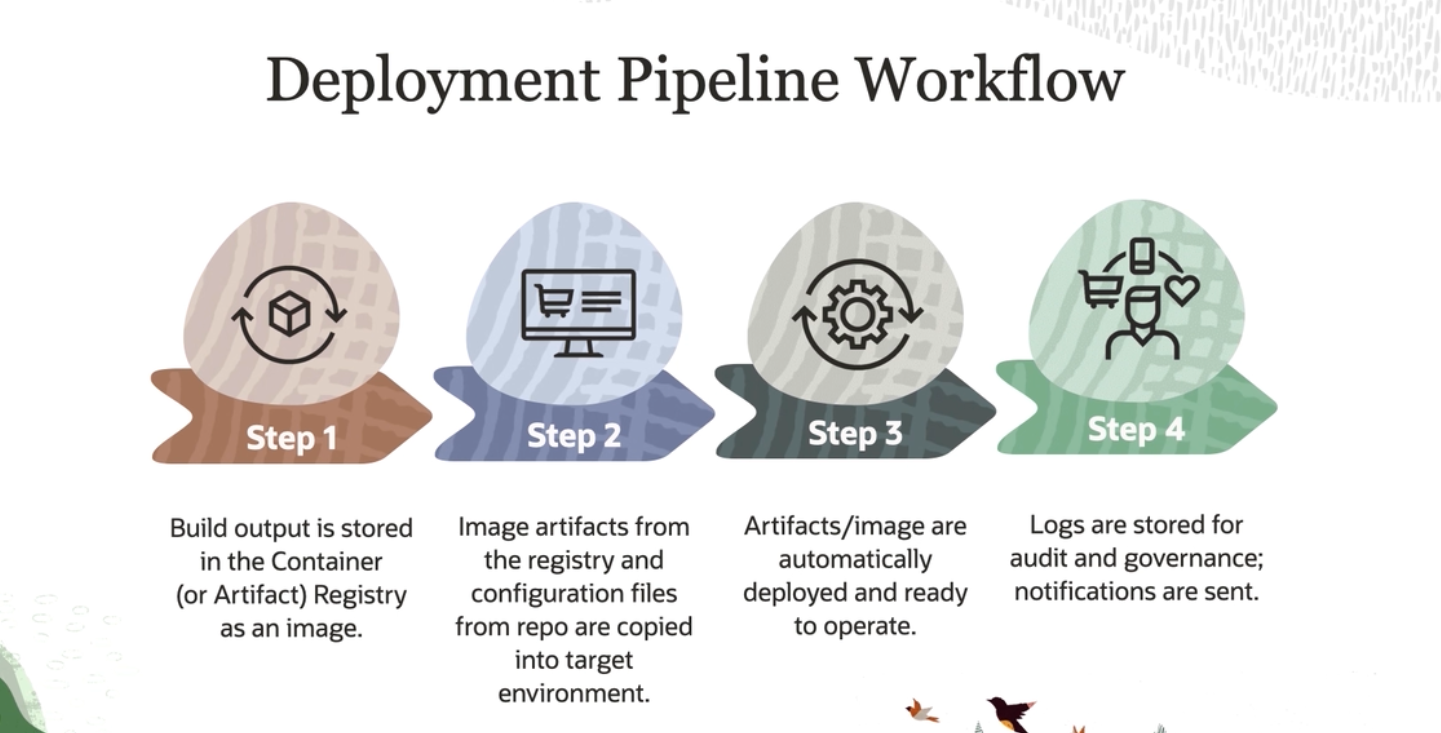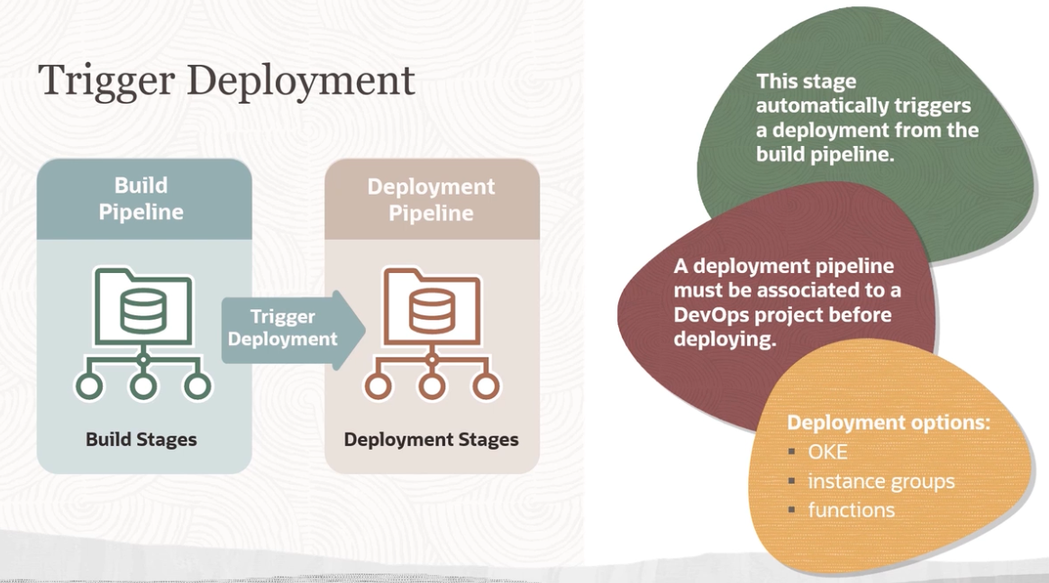 Trigger Deployment This stage automatically triggers a deployment from the build pipeline. Build Pipeline Deployment Pipeline A deployment pipeline must be associated to a DevOps project before deploying. Trigger Deployment Deployment options: Build Stages Deployment Stages - OKE instance groups functions