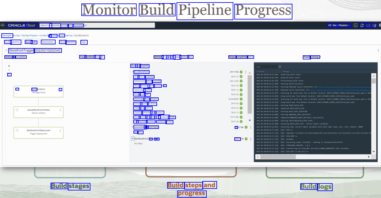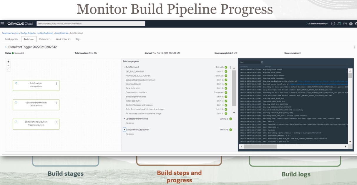 Monitor Build Pipeline Progress ORACLE Cloud Searchtorn resources, ervices, and socumenta USI Nest (Phoent) V 4 0 8 Developer - Project ud Build pipeline Build run Parameters Work requests Tags StorefrontTrigger: 20220210202542 Status: e Succeeded Total durations Tmin 375 Started: Thu Feo 10 2022 202552 UTC Stages completed: 3ef3 Stages running Buldr rung progress BuleStorefront GETJ BUILD RUNNER PROVISIONU BUILD RUNNER Setups softwaret buld environ at Dounicads source Parse buld spec Downicad input artifacts Beract Export variables Instal local JDK17 Confrm Variables and ersions Buids Source and packi into container mage Fixr resources location container mage Upicadstore ef fre ontArtifacts NO: deps ne ert a V Buldt : e Omin Build stages Build steps and progress Build logs