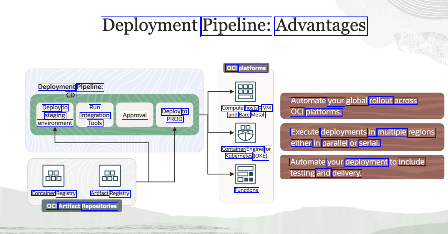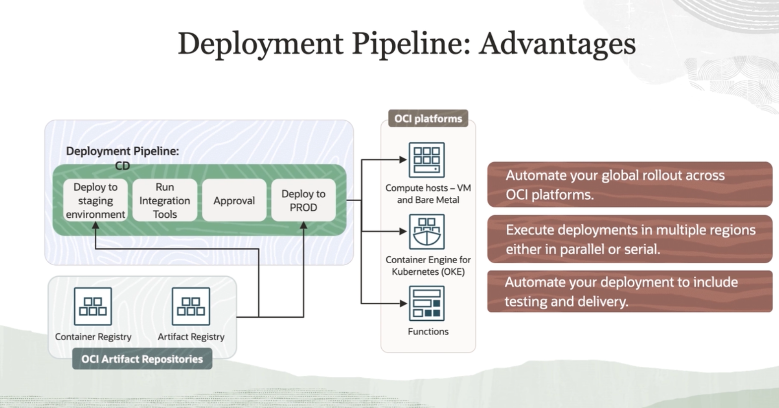 Deployment Pipeline: Advantages OCI platforms Deployment Pipeline: CD Automate your global rollout across Deploy to Run Deploy to PROD Compute hosts - VM and Bare Metal OCI platforms. staging Integration Approval environment Tools Execute deployments in multiple regions either in parallel or serial. Container Engine for Kubernetes (OKE) Automate your deployment to include testing and delivery. Container Registry Artifact Registry OCI Artifact Repositories Functions