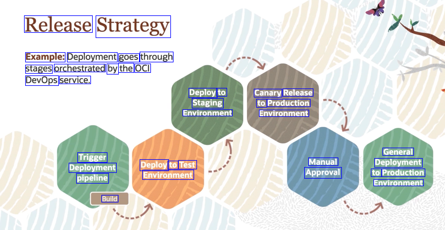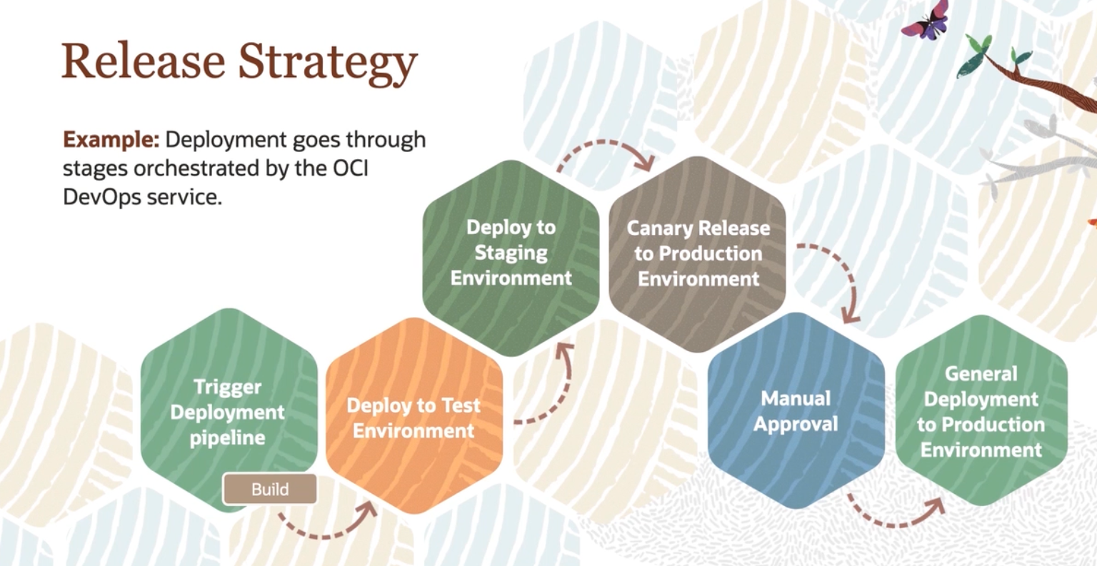 Release Strategy Example: Deployment goes through stages orchestrated by the OCI DevOps service. Deploy to Staging Environment Canary Release to Production Environment General Deployment to Production Environment Trigger Deployment pipeline Manual Approval Deploy to Test Environment Build