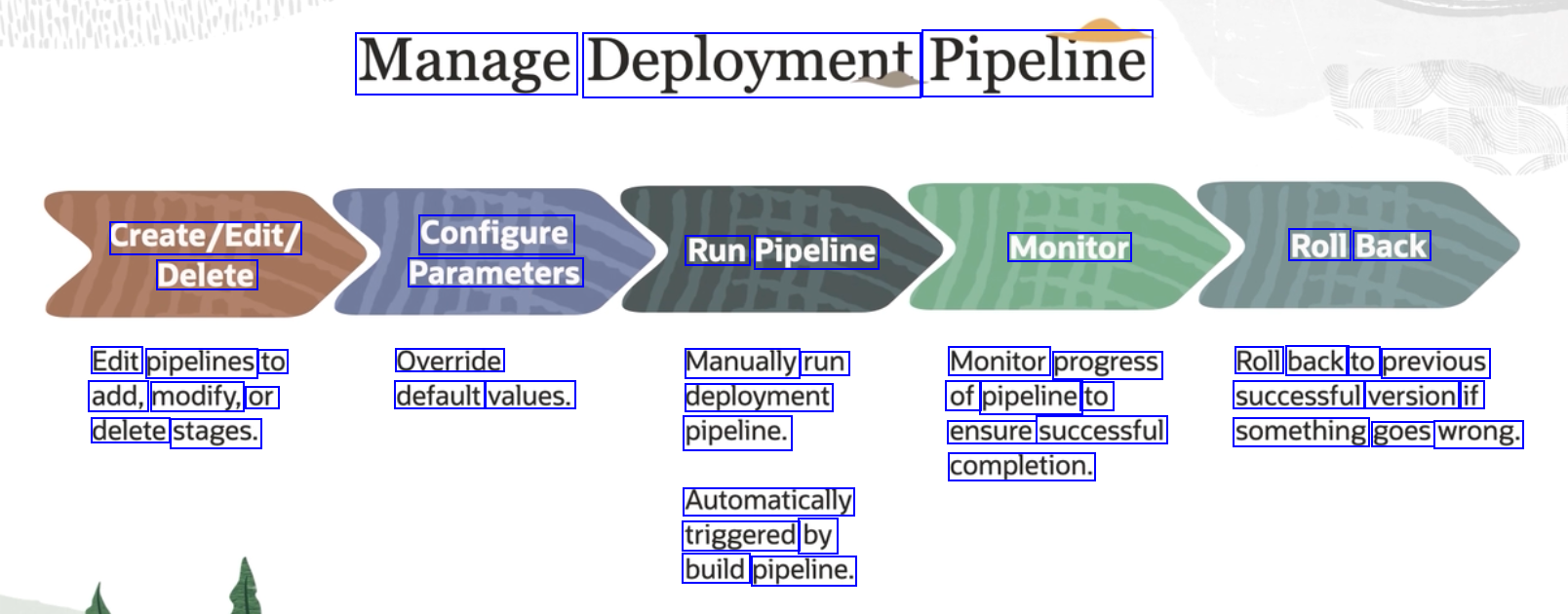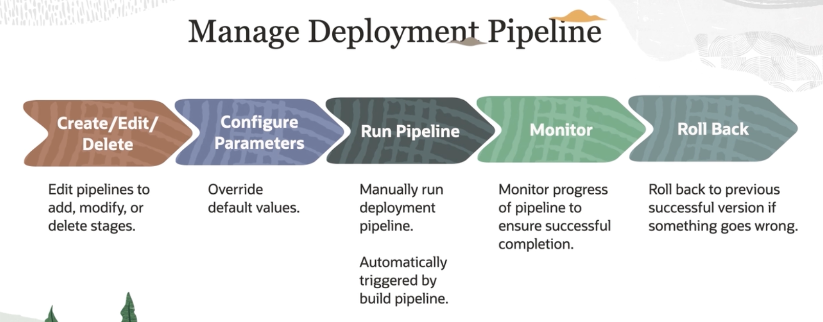 Manage Deployment Pipeline Create/Edit/ Configure Run Pipeline Monitor Roll Back Delete Parameters Edit pipelines to add, modify, or delete stages. Override default values. Manually run deployment pipeline. Monitor progress of pipeline to ensure successful completion. Roll back to previous successful version if something goes wrong. Automatically triggered by build pipeline.