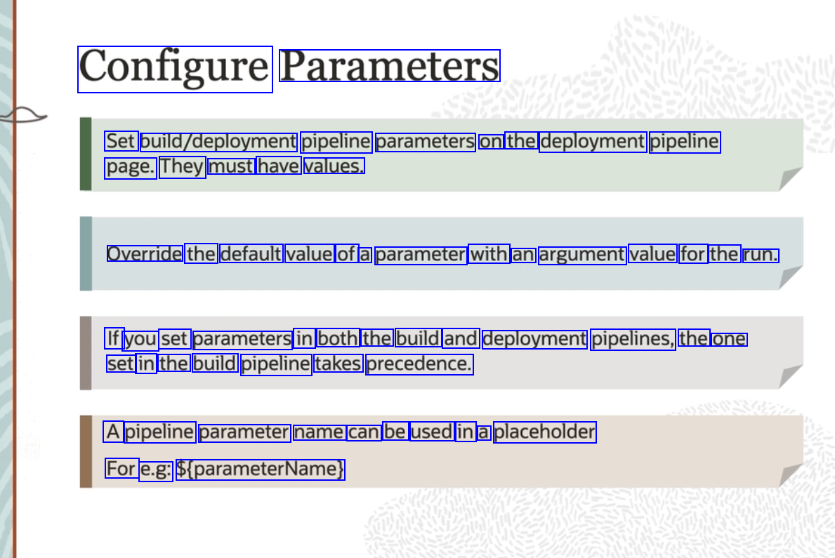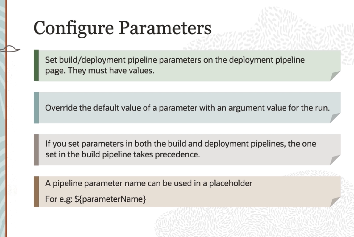 Configure Parameters Set bulld/deployment pipeline parameters on the deployment pipeline page. They must have values. Override the default value of a parameter with an argument value for the run. If you set parameters in both the build and deployment pipelines, the one set in the build pipeline takes precedence. A pipeline parameter name can be used in a placeholder For e.g: S(parameterName)