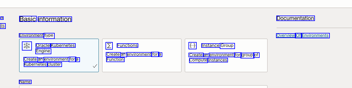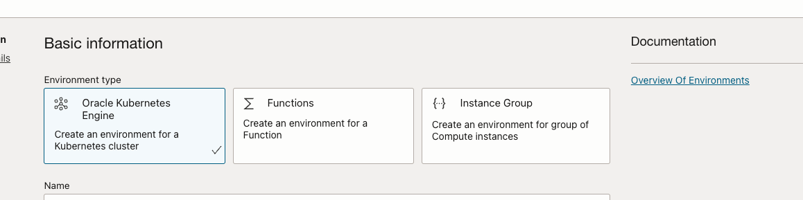 1 Basic information Documentation ils Environment type Overview Of Environments as Oracle Kubernetes N Functions € Instance Group Engine Create an environment for a Create an environment for group of Compute instances Create an environment for a Kubernetes cluster Function Name
