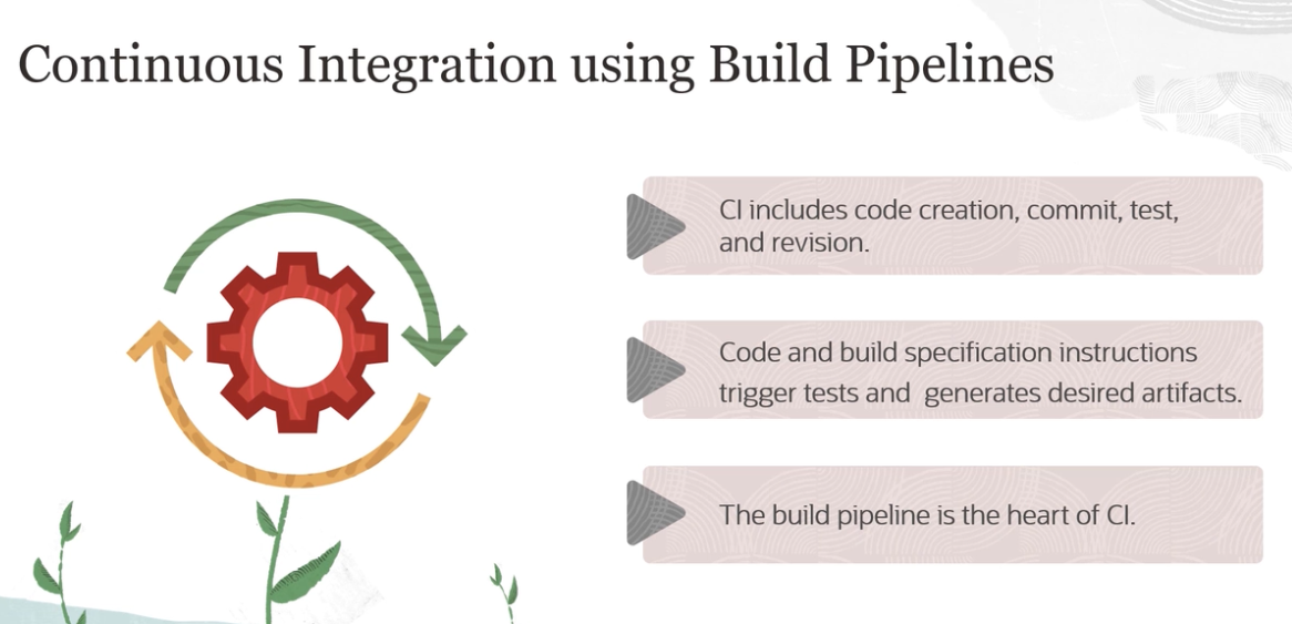 Continuous Integration using Build Pipelines Clincludes code creation, commit, test, and revision. - - - / Code and build specification instructions - - trigger tests and generates desired artifacts. O The build pipeline is the heart of Cl.