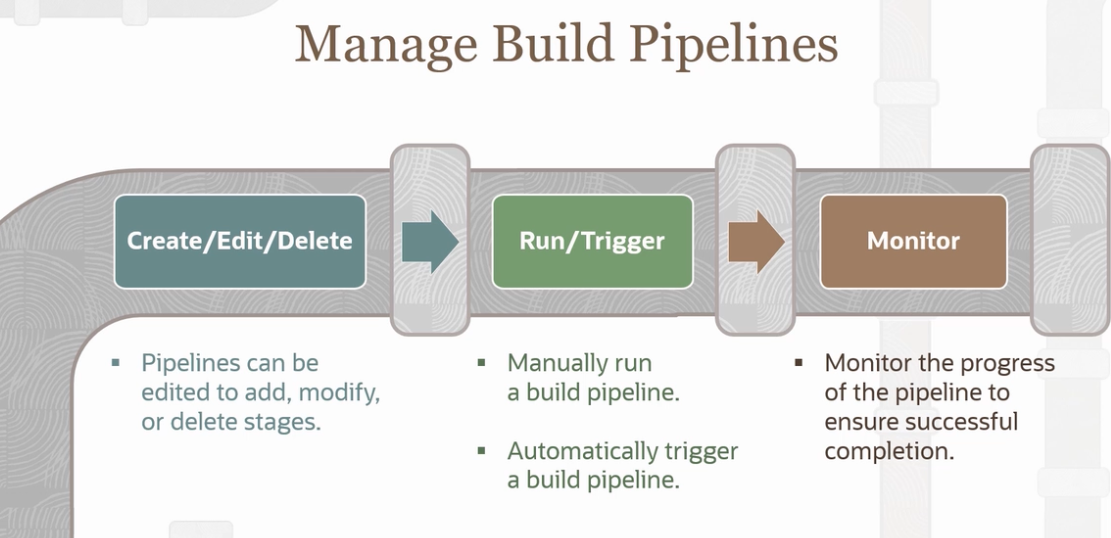 Manage Build Pipelines Create/Edit/Delete Run/Trigger Monitor Pipelines can be Manually run a build pipeline. Monitor the progress of the pipeline to ensure successful completion. edited to add, modify, or delete stages. Automatically trigger a build pipeline.