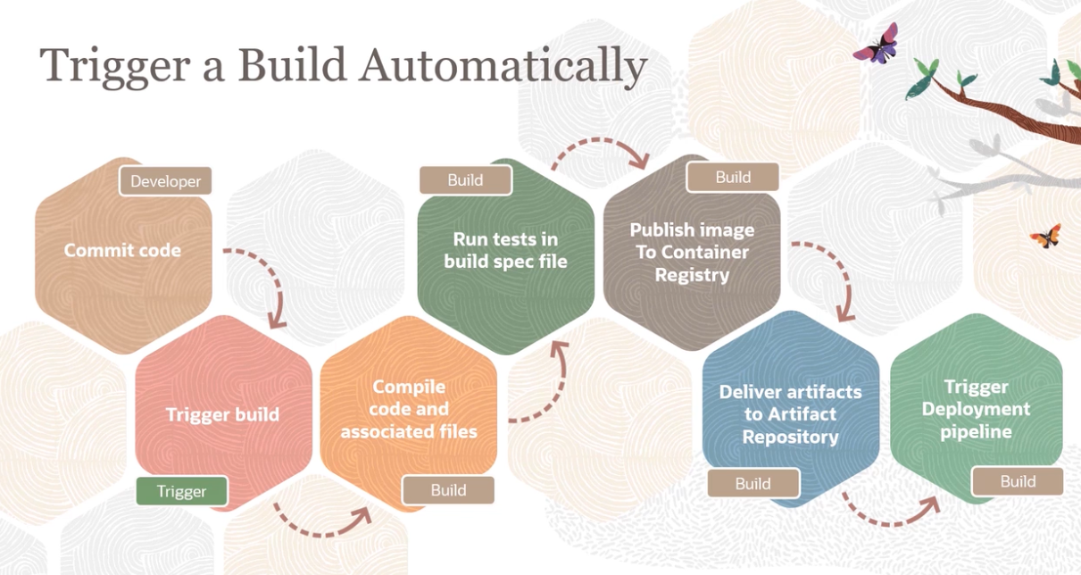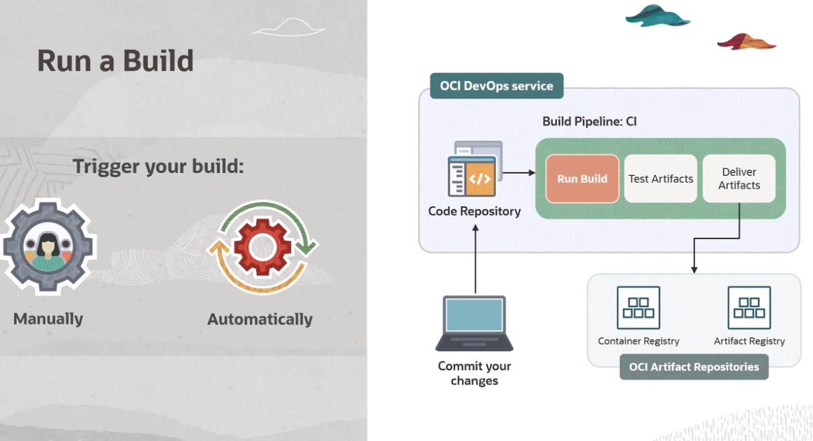 Run a Build OCI DevOps service Build Pipeline: CI Trigger your build: Deliver Run Build Test Artifacts Artifacts E Code Repository en DE I DO Manually Automatically Container Registry Artifact Registry Commit your changes OCI Artifact Repositories