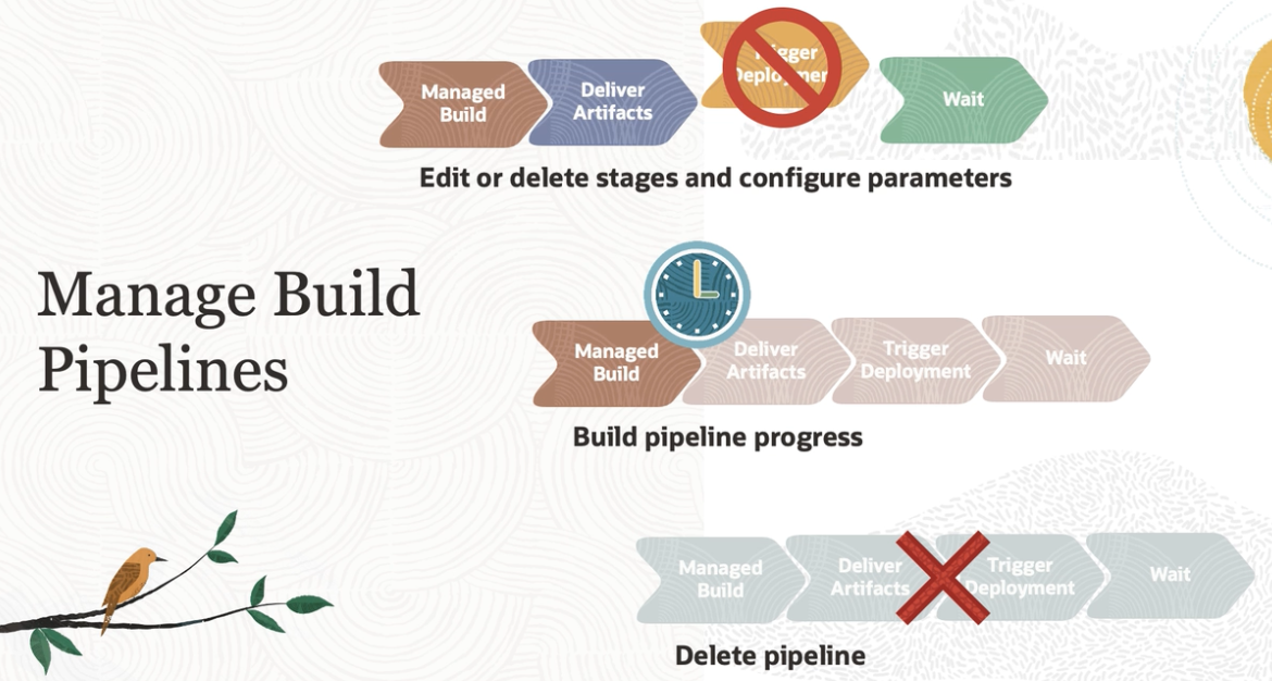 eger leplo, ner Managed Build Deliver Artifacts Wait Edit or delete stages and configure parameters Manage Build Managed Build Deliver Artifacts Trigger Deployment Wait Pipelines Build pipeline progress Managed Build Deliver Artifacts Trigger Deployment Wait Delete pipeline