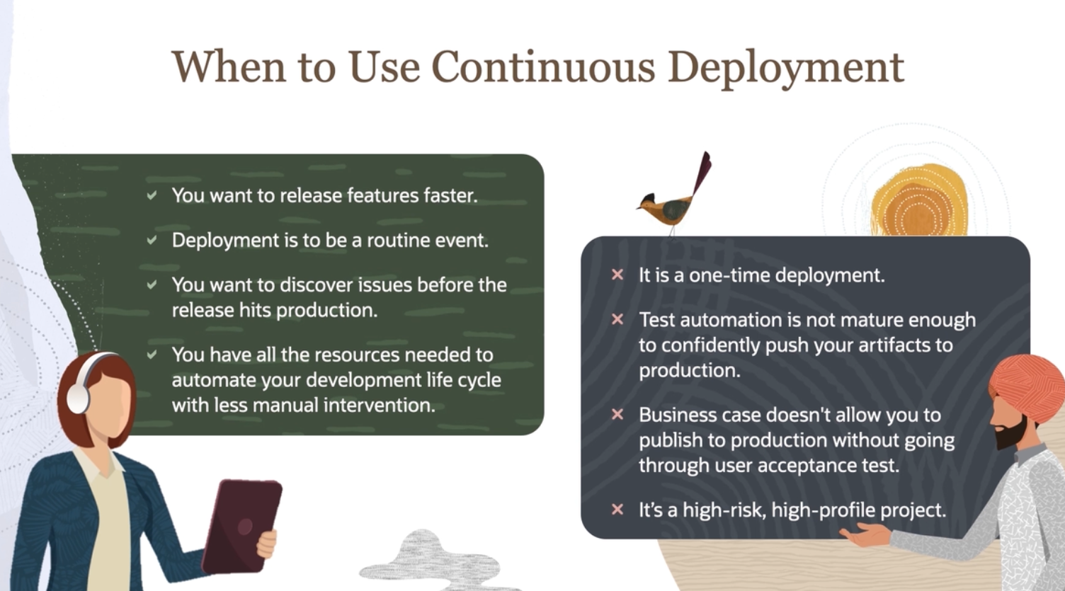 When to Use Continuous Deployment You want to release features faster. Deployment is to be a routine event. X Itis a one-time deployment. You want to discover issues before the release hits production. X Test automation is not mature enough to confidently push your artifacts to You have all the resources needed to automate your development life cycle with less manual intervention. production. X Business case doesn't allow you to publish to production without going through user acceptance test. X It's a high-risk, high-profile project.