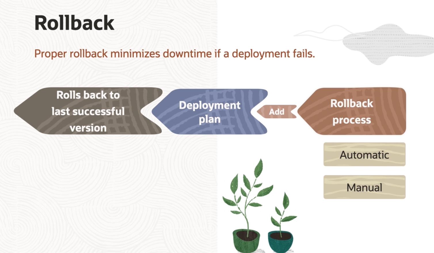 Rollback Proper rollback minimizes downtime if a deployment fails. Rolls back to Deployment Rollback last successful Add plan process version Automatic 1 - Manual - -
