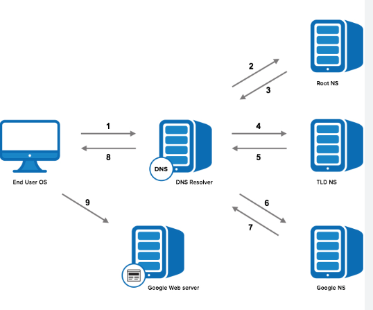 - 2 Root NS 3 1 - - - - 8 5 - DNS End User OS DNS Resolver TLD NS 9 6 7 - Google Web server Google NS