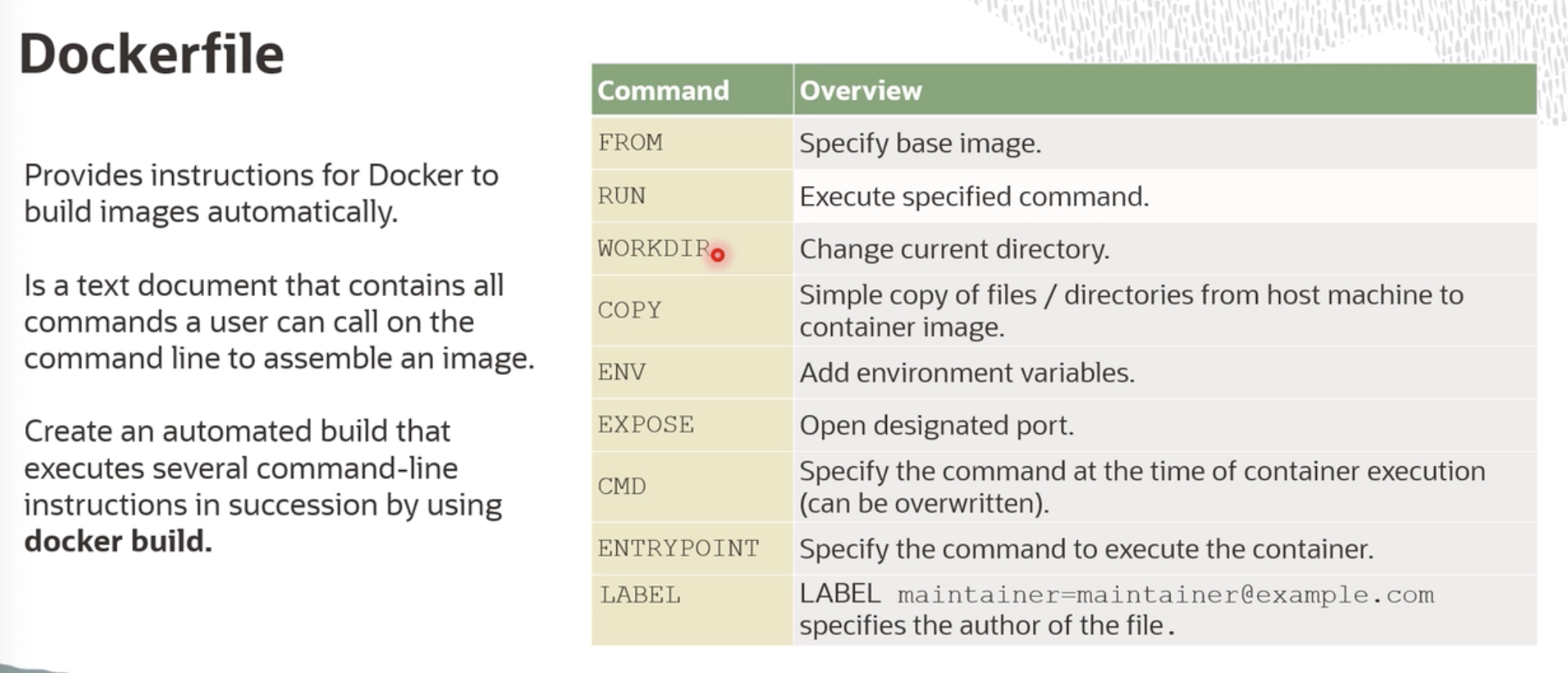 - RUN: Can be many, and it is used in build process, e.g. install multiple libraries (of image)