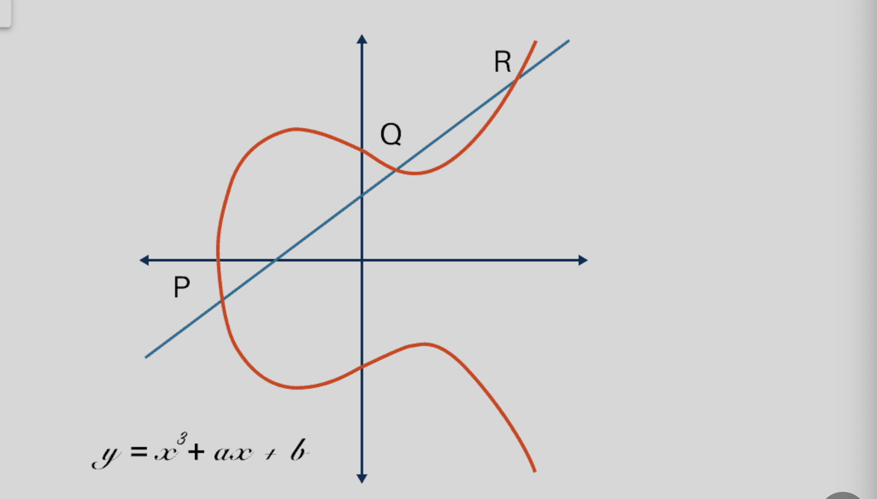 In this elliptic curve cryptography example, any point on the curve can be mirrored over the x-axis and the curve will stay the same. Any non-vertical line will intersect the curve in three places or fewer.