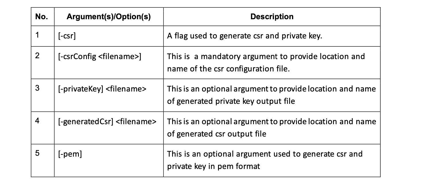 No. ArgumentisJOption's) Description 1 [-csr] A flag used to generate csr and private key. 2 -csrConfig <filename>] This is a mandatory argument to provide location and name of the csr configuration file. 3 I-privateKey] <filename> This is an optionalargument to providelocation and name of generated private key output file 4 I-generatedCsr] <filename> This is an optionalargument to providelocation and name of generated csr output file 5 [-pem] This is an optional argument used to generate csr and private key in pem format