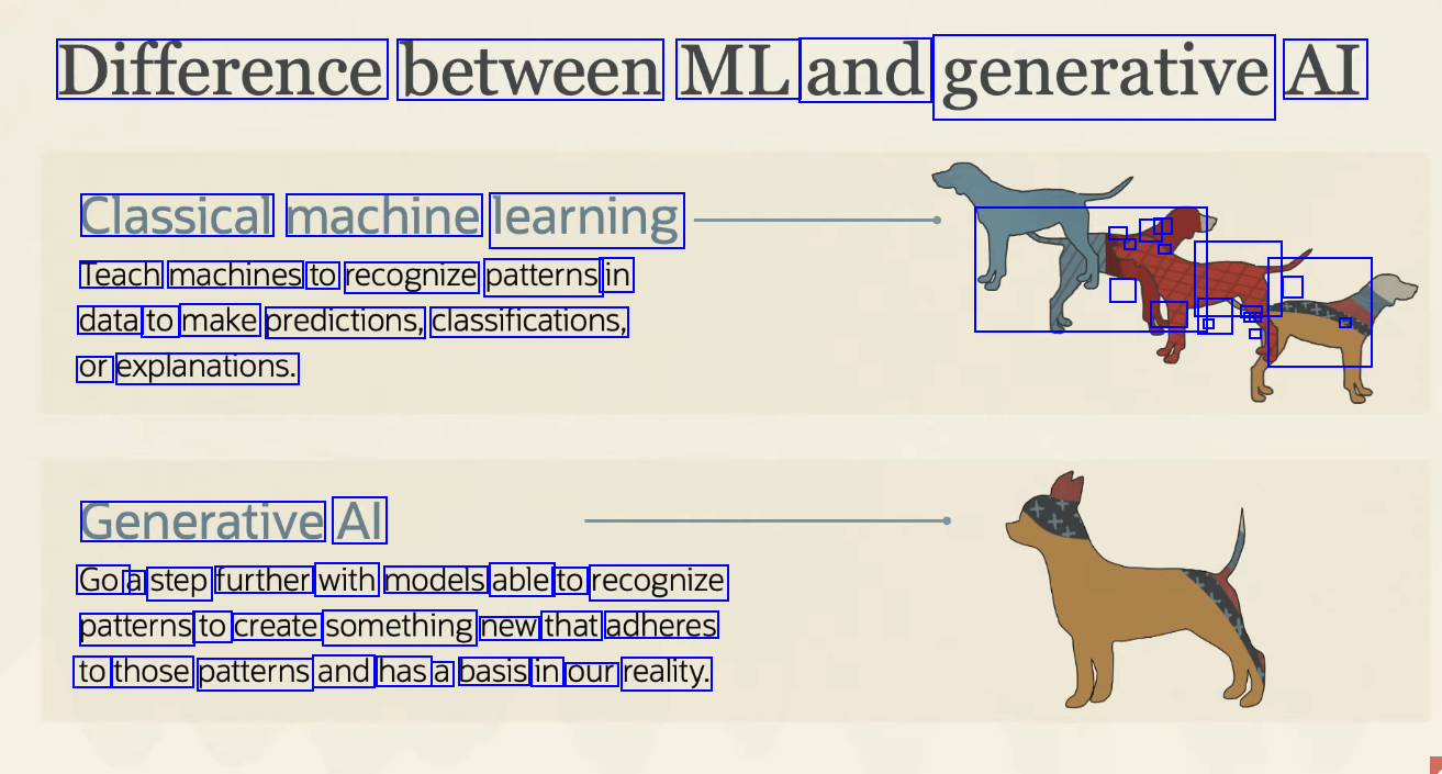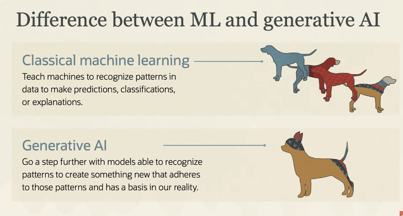 Difference between ML and generative AI Classical machine learning - - - - - - Teach machines to recognize patterns in data to make predictions, classifications, - - 1 - - - - A - - - - or explanations. Generative Al Go a step further with models able to recognize patterns to create something new that adheres to those patterns and has a basis in our reality.