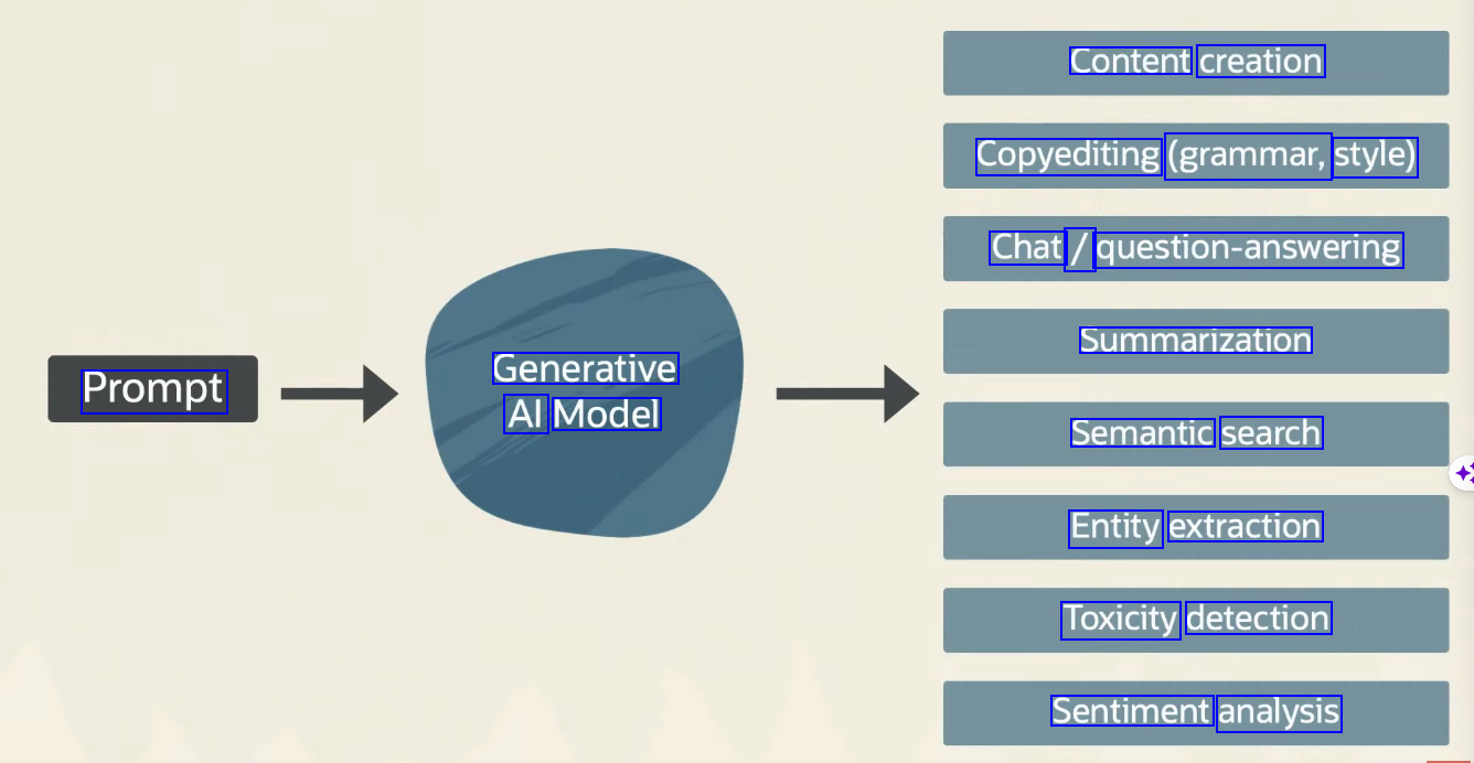 Content creation Copyediting (grammar, style) Chat / question-answering Summarization Generative Al Model Prompt Semantic search Entity extraction Toxicity detection Sentiment analysis