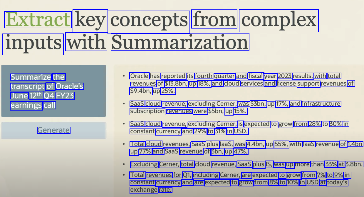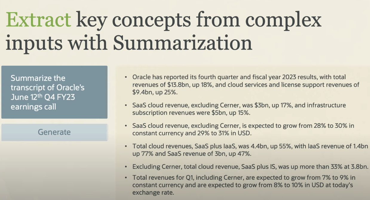 Extract key concepts from complex inputs with Summarization Summarize the transcript of Oracle's June 12th Q4 FY23 earnings call Oracle has reported its fourth quarter and fiscal year 2023 results, with total revenues of $13.8bn, up 18%, and cloud services and license support revenues of $9.4bn, up 25%. Saas cloud revenue, excluding Cerner, was $3bn, up 17%, and infrastructure subscription revenues were $5bn, up 15%. Saas cloud revenue, excluding Cerner, is expected to grow from 28% to 30% in Generate constant currency and 29% to 31% in USD. Total cloud revenues, Saas plus laas, was 4.4bn, up 55%, with laas revenue of 1.4bn up 77% and Saas revenue of 3bn, up 47%. Excluding Cerner, total cloud revenue, Saas plus IS, was up more than 33% at 3.8bn. Total revenues for Q1, including Cerner, are expected to grow from 7% to 9% in constant currency and are expected to grow from 8% to 10% in USD at today's exchange rate.
