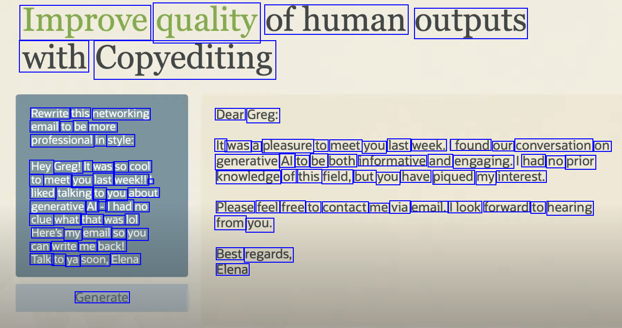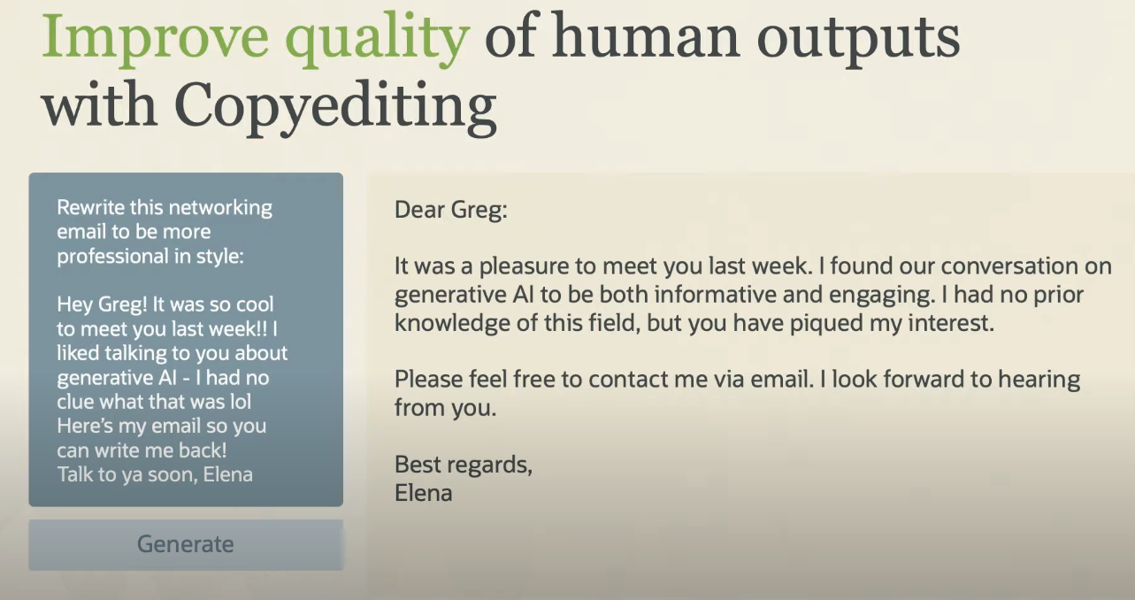 Improve quality ofhuman outputs with Copyediting Rewrite this networking email to be more professional in style: Dear Greg: It was a pleasure to meet you last week. found our conversation on generative Al to be both informative and engaging. had no prior knowledge of this field, but you have piqued my interest. Hey Greg! It was SO cool to meet you last week!! - liked talking to you about generative Al - Ihad no clue what that was lol Here's my email SO you can write me back! Talk to ya soon, Elena Please feel free to contact me via email. Ilook forward to hearing from you. Best regards, Elena Generate