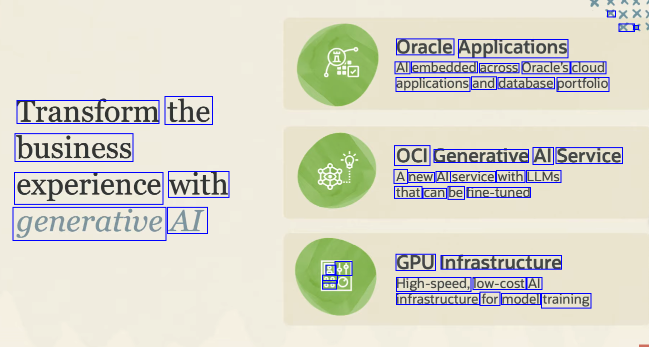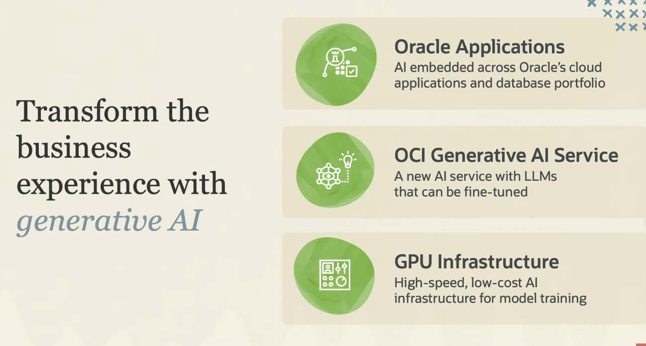A X - Oracle Applications Al embedded across Oracle's cloud applications and database portfolio Transform the business OCI Generative Al Service A new Al service with LLMS that can be fine-tuned with experience generative AI GPU Infrastructure D 49 00 00 High-speed, low-cost Al infrastructure for model training