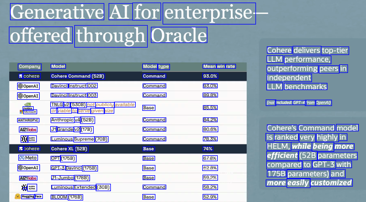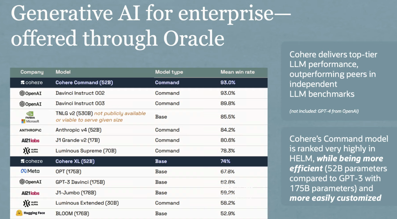 Generative AI for enterprise offered through Oracle Cohere delivers top-tier LLM performance, outperforming peers in independent LLM benchmarks Company Model Model type Command Command Command Base Mean win rate 93.0% 93.0% 89.8% 85.5% 84.2% 80.6% 78.3% 74% 67.8% 62.8% 59.2% 58.2% 52.9% 3 cohere Cohere Command (52B) GOpenAI Davinci Instruct 002 GOpenAI Davinci Instruct 003 TNLG v2 (530B) not publicly available or viable to serve given size (not included: GPT-4) from OpenAl) NVIDIA Microsoft ANTHROPIC Anthropic v4 (52B) Command Command Command Base Base Base Base Command Base Al21labs ARTE J1 Grande v2 (17B) Luminous Supreme (70B) Cohere's Command model is ranked very highly in HELM, while being more efficient (52B parameters a cohere Cohere XL (52B) 00Meta GOpenAI Al21labs a am OPT (175B) GPT-3 Davinci (175B) J1-Jumbo (178B) Luminous Extended (30B) with to GPT-3 compared 175B and parameters) more customized easily Hugging Face BLOOM (176B)