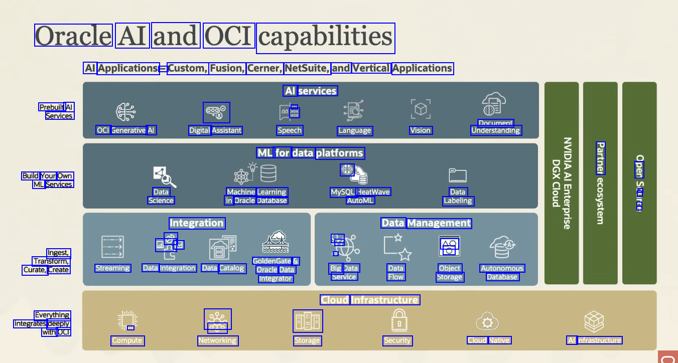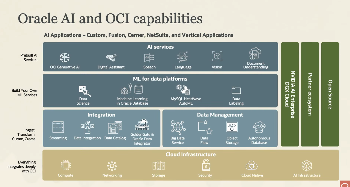 Oracle AI and OCI capabilities Al Applications - Custom, Fusion, Cerner, NetSuite, and Vertical Applications Al services COX xOX Speech Prebuilt Al Services GaO Digital Assistant Document Understanding OCI Generative Al Language Vision ML for data platforms €5 - Build Your Own ML Services B Data Science Machine Learning in Oracle Database MySQLI HeatWave AutoML Data Labeling - 2 a a Integration 0 mA E Data Management 97 71 ) Big Data Service AO O Ingest, Transform, Curate, Create GoldenGate & Integrator Streaming Data Integration Data Catalog Oracle Data Data Flow Object Autonomous Storage Database Cloud Infrastructure Everything integrates deeply with OCI 38e ogo Networking "I Compute EEB Storage Security Cloud Native Al Infrastructure