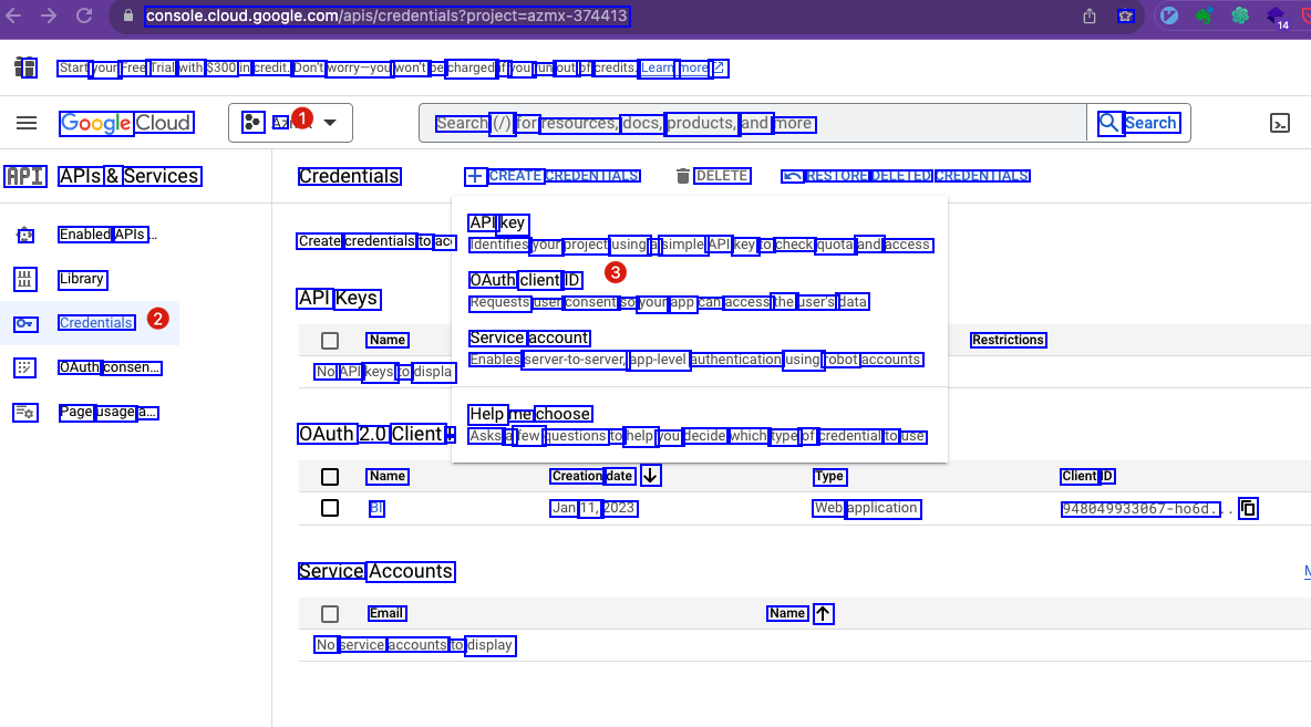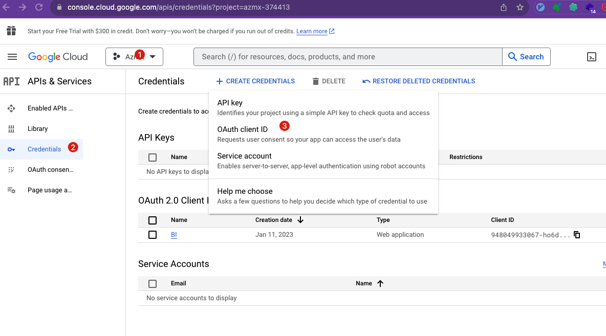 console.cloud.googoogle.comjapisycredentials/project-azmx-374413 A B Start your Free Trial with $300 in credit. Don't worry-you won't be charged if you run out of credits. Learn more E Google Cloud : Az Search () for resources, docs, products, and more Q Search API APIs & Services Credentials + CREATE CREDENTIALS DELETE K RESTORE DELETED CREDENTIALS API key e Enabled APIs H Library Create credentials to aci Identifies your project using a simple API key to check quota and access OAuth client ID API Keys Requests user consent sO your app can access the user's data Or Credentials : OAuth consen... Fo Page usage a.. Name No API keys to displa Service account Restrictions Enables server-to-server, app-level authentication using robot accounts Help me choose OAuth 2.0 Client - - Asks a few questions to help you decide which type of credential to use Name BI Creation date L Jan 11, 2023 Type Web application Client ID 948049933667-ho6d. 0 Service Accounts Email No service accounts to display Name T