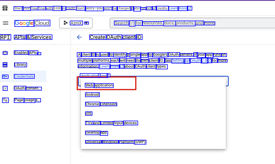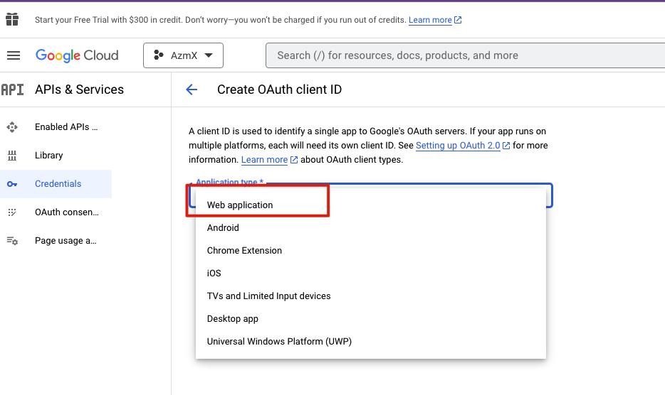 Start your Free Trial with $300 in credit. Don't worry-you won't be charged if you run out of credits. Learn more E Google Cloud AzmX - Search () for resources, docs, products, and more API APIS & Services Create OAuth client ID Enabled APls - A client ID is used to identify a single app to Google's OAuth servers. If your app runs on multiple platforms, each will need its own client ID. See Setting up OAuth 2.0 for more E LI Library information. Learn more E about OAuth client types. Or Credentials Annlication tvne * Web application Android : OAuth consen... Fo Page usage a... Chrome Extension iOS TVs and Limited Input devices Desktop app Universal Windows Platform (UWP)
