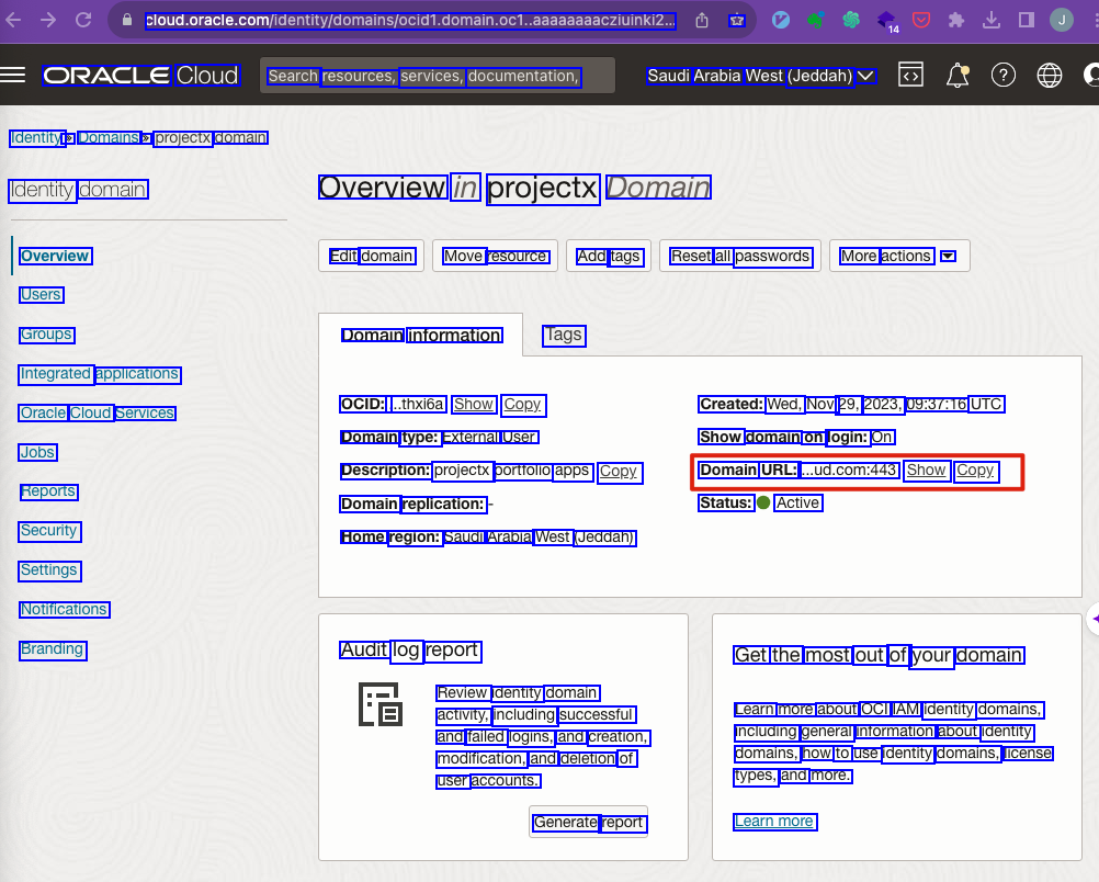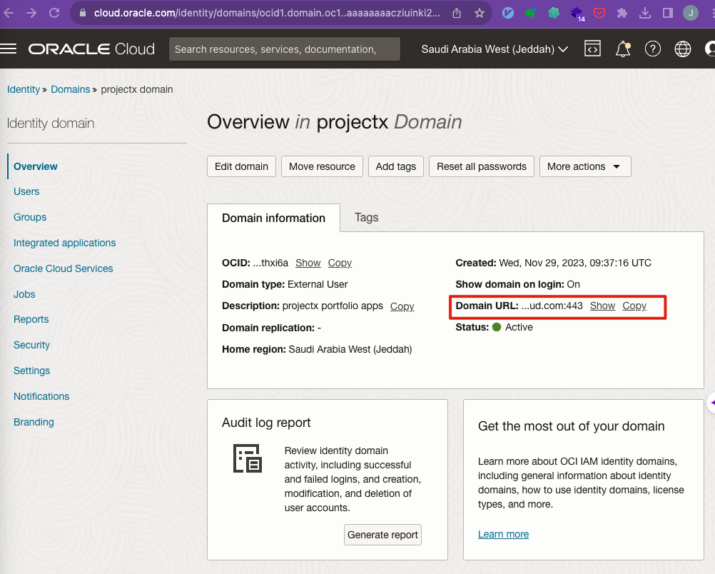 cloud.oracle.com/ldentity/domains/ocidi.domaln.ocl.aaaaaaacziuinki2.. 17 ORACLE Cloud Search resources, services, documentation, Saudi Arabia West (Jeddah) V Identity: > Domains X projectx domain Identity domain Overview in projectx Domain Overview Users Groups Edit domain Move resource Add tags Reset all passwords More actions V Domain information Tags Integrated applications Oracle Cloud Services Jobs Reports Security Settings Notifications Branding OCID: ...thxi6a Show Copy Domain type: External User Description: projectx porttolio apps Copy Created: Wed, Nov 29, Show domain on login: On Domain URL: ..ud.com:443 Show Copy 09:37:16 UTC 2023, Domain replication: Status: Active Home region: Saudi Arabia West Jeddah) Audit log report Get the most out of your domain Review identity domain activity, including successful and failed logins, and creation, modification, and deletion of user accounts. Learn more about OCI IAM identity domains, including general information about identity domains, how to use identity domains, icense types, and more. Learnmore Generate report