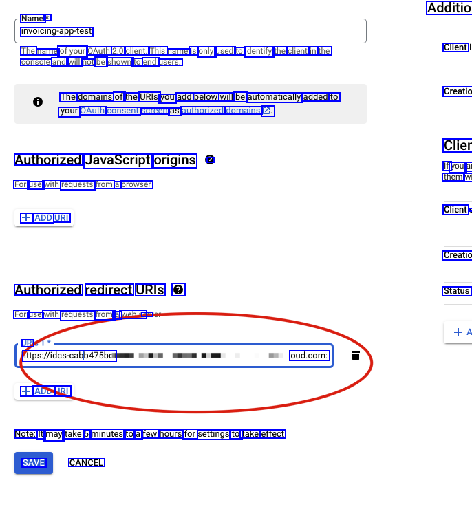 Additio Name * invoicing-app-test The name ofyour OAuth 2.0 client. This name is only used to identify the client in the Client console and will not be shown to end users. Creatio The domains of the URIs you add below will be automatically added to your OAuth consent screen as authorized domains Z. Clier If you ar them Wi Client - Authorized JavaScript origins R. For use with requests from a browser + ADD URI Creatio Authorized redirect URIs 0 For use with requests from a weba ar Status UR ltps/idcs-cabb475ba oud.com: + ADDA URI Note: It may take 5 minutes to a few hours for settings to take effect SAVE CANCEL