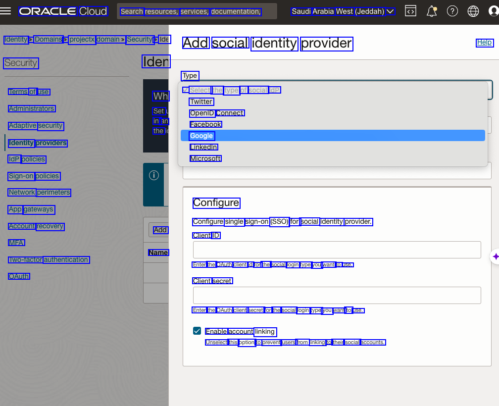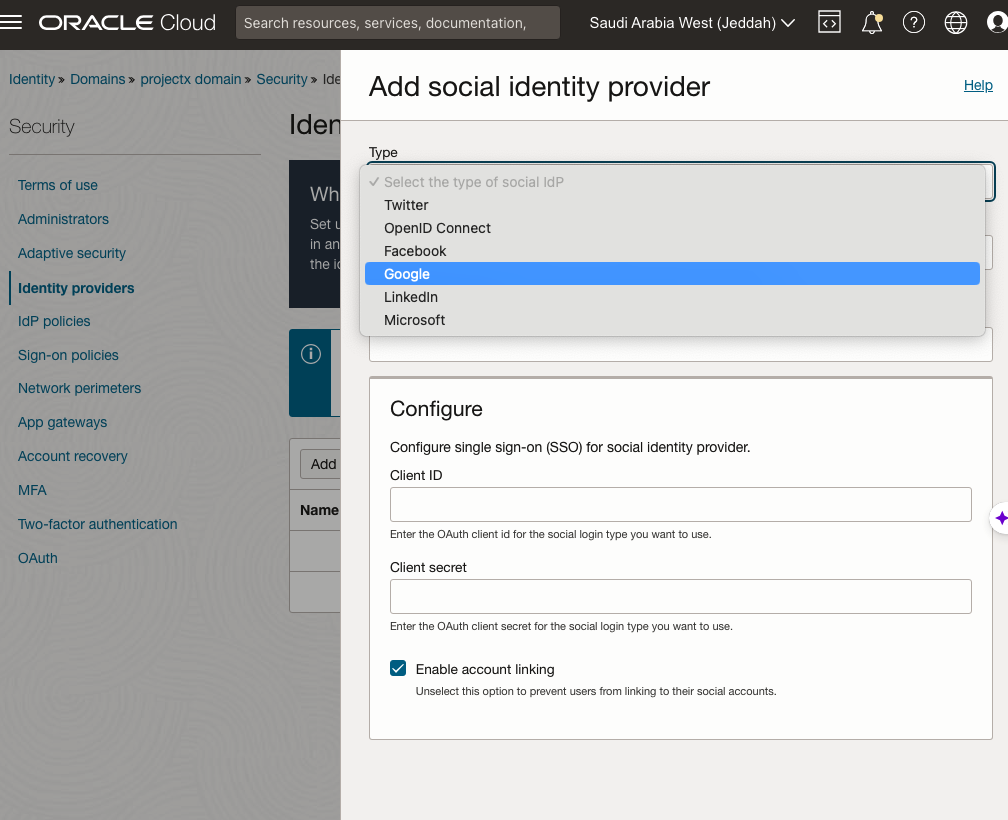 ORACLE Cloud Search resources, services, documentation, Saudi Arabia West (Jeddah) V Identity > Domains > projectx domain> Security > Ide Add social Help identity provider Security Iden Type Terms of use Administrators Adaptive security Identity providers IdP policies Sign-on policies Network perimeters App gateways Account recovery MFA V Select the type of social IdP Twitter OpenID Connect Facebook Google Linkedin Microsoft Wh Set in: an the Configure Configure single sign-on (SSO) for social identity provider. Add Name Client ID TWO-factor authentication OAuth Enter the OAuth client id for the social login type you want to use. Client secret Enter the OAuth client secret for the social login type you want to use. Enable account linking Unselect this option to prevent users from linking to their social accounts.