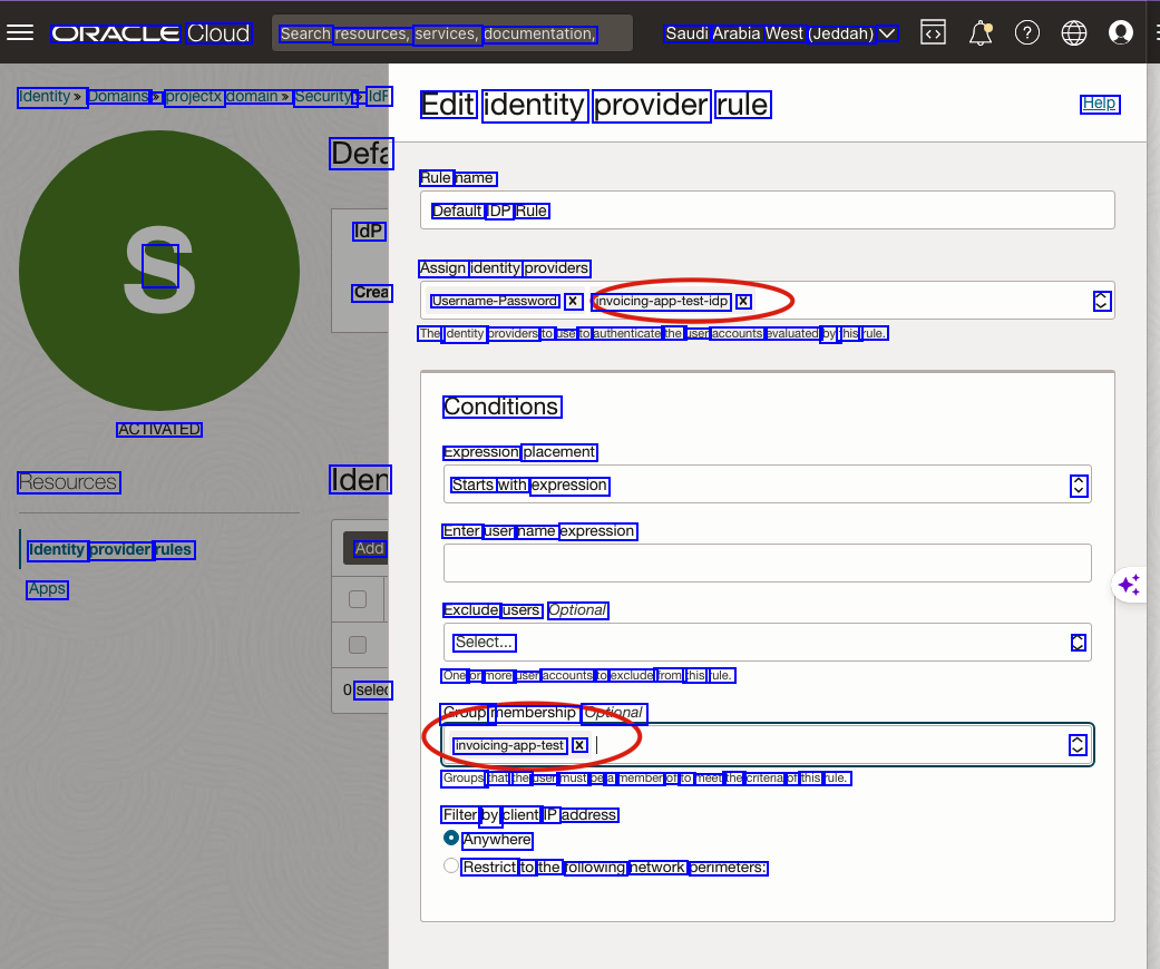 ORACLE Cloud Search resources, services, documentation, Saudi Arabia West Jeddah) V Identity> Domains > projectx domain> Security: > IdF Edit identity provider rule Help Defa Rule name Default IDP Rule IdP - Assign identity providers Crea Username-Password x (nvoicing-app-test-idp X C The identity providers to use to authenticate the user accounts evaluated by this rule. Conditions Expression placement Starts with expression Enter user name expression ACTIVATED Resources Iden C Identity provider rules Apps Add Exclude users Optional Select... C One or more user accounts to exclude from this rule. Croup membership Uptional invoicing-app-test X selec C Groups that the user must be a member of to meet the criteria of this rule. Filter by client IP address Anywhere Restrict to the following network perimeters: