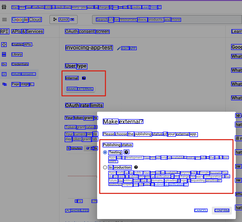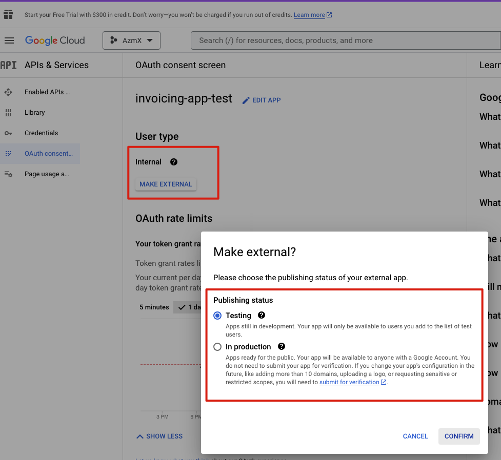 Start your Free Trial with $300 in credit. Don't worry-you won't be charged if you run out of credits. Learn more E Google Cloud API APIS & Services € Enabled APIs L LLI Library Or Credentials : OAuth consent... E a Page usage a... AzmX Search () for resources, docs, products, and more OAuth consent screen Learr invoicing-app-test EDIT APP Goog What What What What User type Internal ? MAKE EXTERNAL OAuth rate limits Your token grant ra Token grant rates li day token grant rate 5 minutes / 1 da ne hat illn hat Make external? Your current per da Please choose the publishing status of your external app. Publishing status Testing @ users. In production Apps still in development. Your app will only be available to users you add to the list of test DW DW oma hat Apps ready for the public. Your app will be available to anyone with a Google Account. You do not need to submit your app for verification. If you change your app's configuration in the future, like adding more than 10 domains, uploading a logo, or requesting sensitive or restricted scopes, you will need to submit for verification E. 3 PM A SHOW LESS 6PM CANCEL CONFIRM